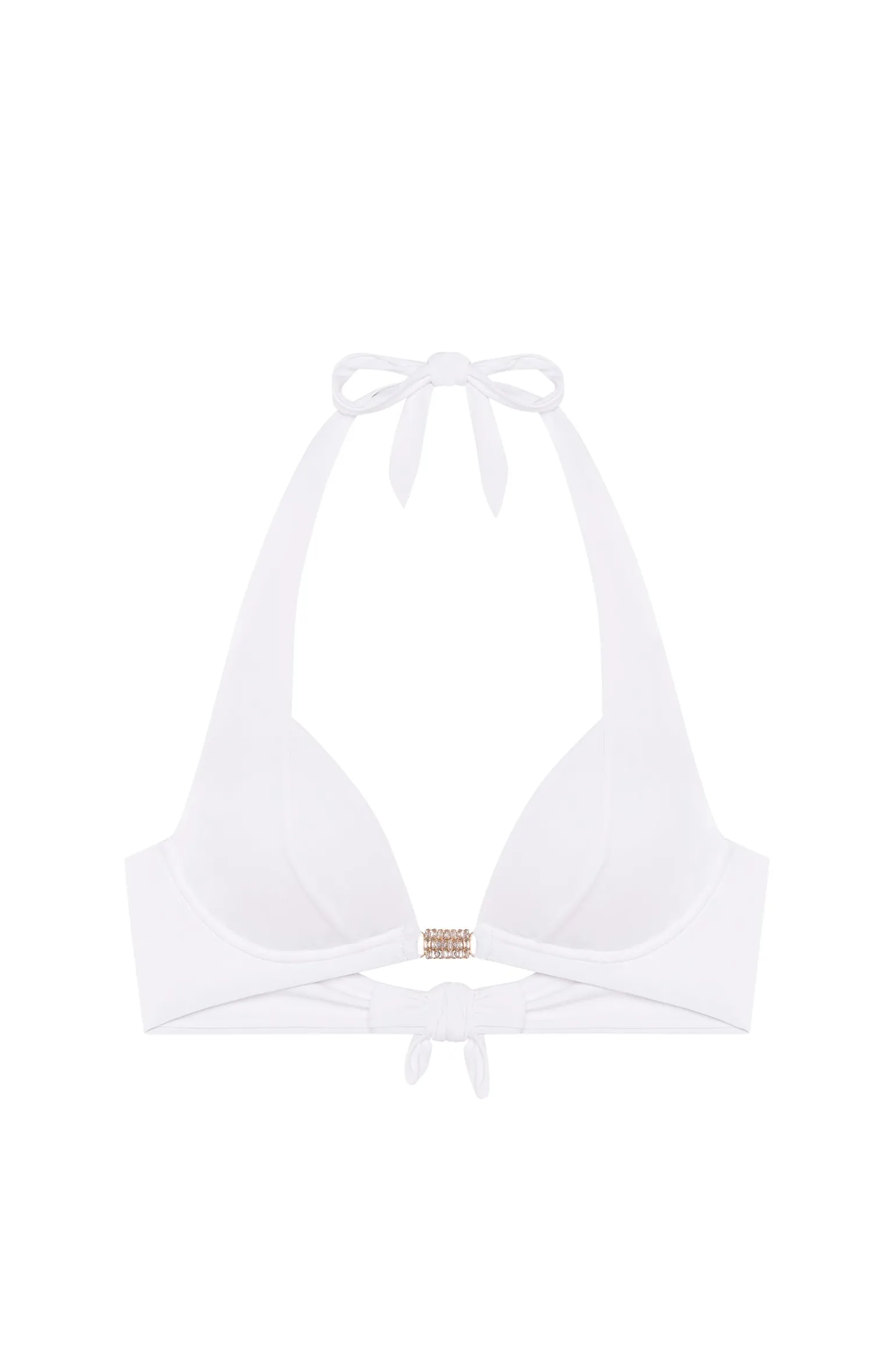 ARYANA est un haut de maillot très sophistiqué. Ses bonnets doublés donnent un généreux volume à la poitrine et le bijou, délicatement placé à l’entre-seins, sublime le décolleté. Les larges bretelles permettent de varier les façons de porter ce haut de bikini. Pur et délicat, le blanc illumine le teint.