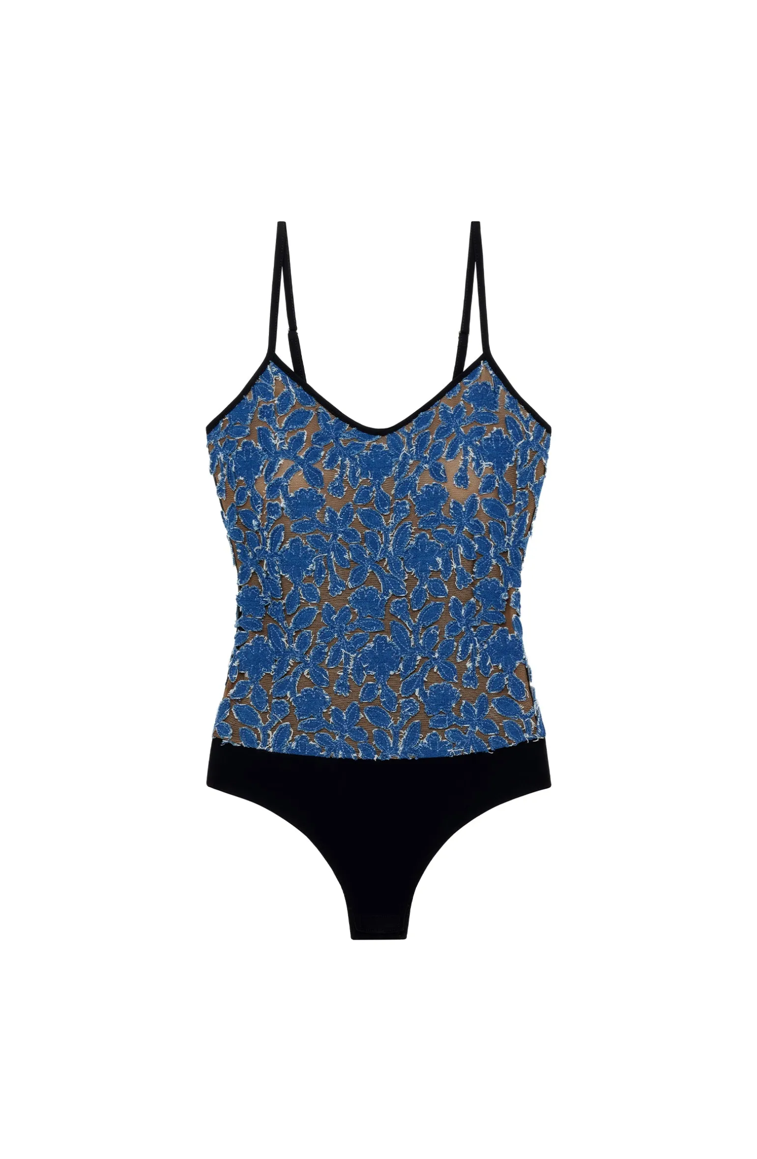 - Body avec broderie en jean sur fine résille noire transparente avec motifs à fleurs