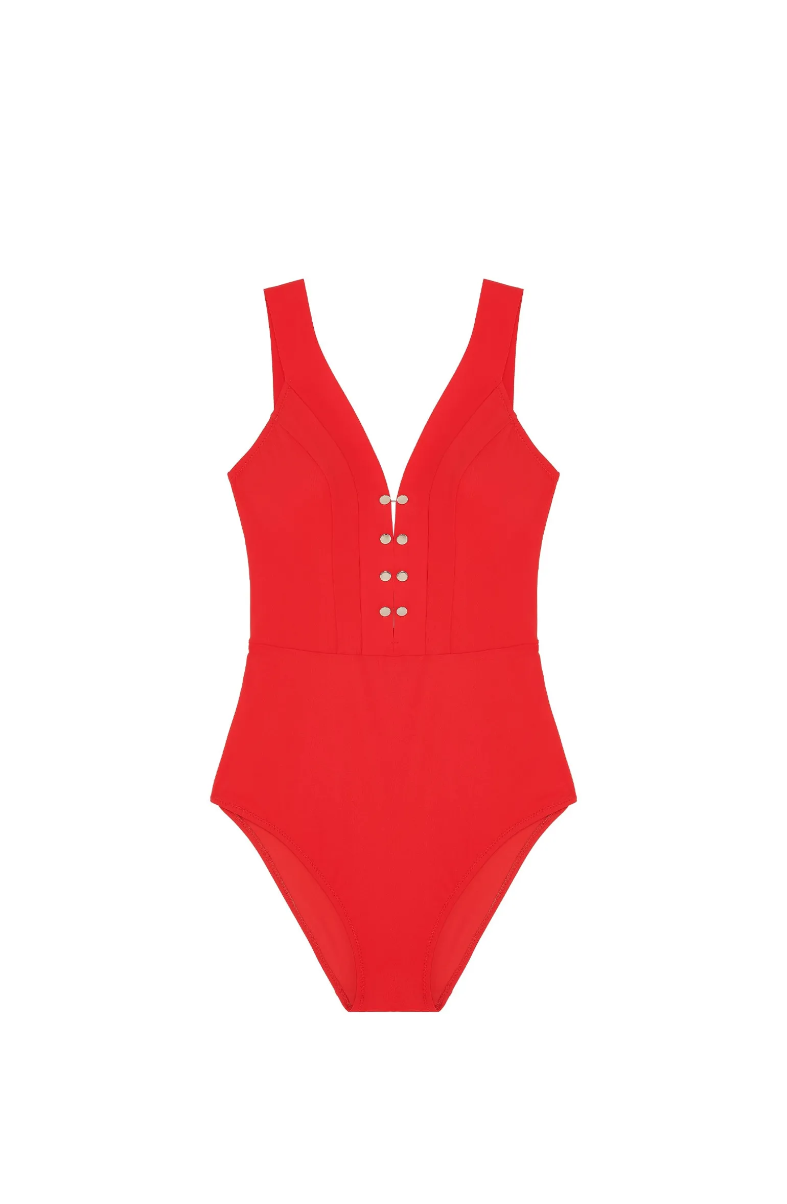 Iconique et indémodable, le maillot de bain BONNIE assure un confort et un maintien parfait. Son décolleté s’habille de bijoux boutons de manchette pour souligner avec chic et volupté la poitrine. UUn rouge éclatant et audacieux, couleur intemporelle du dressing balnéaire.