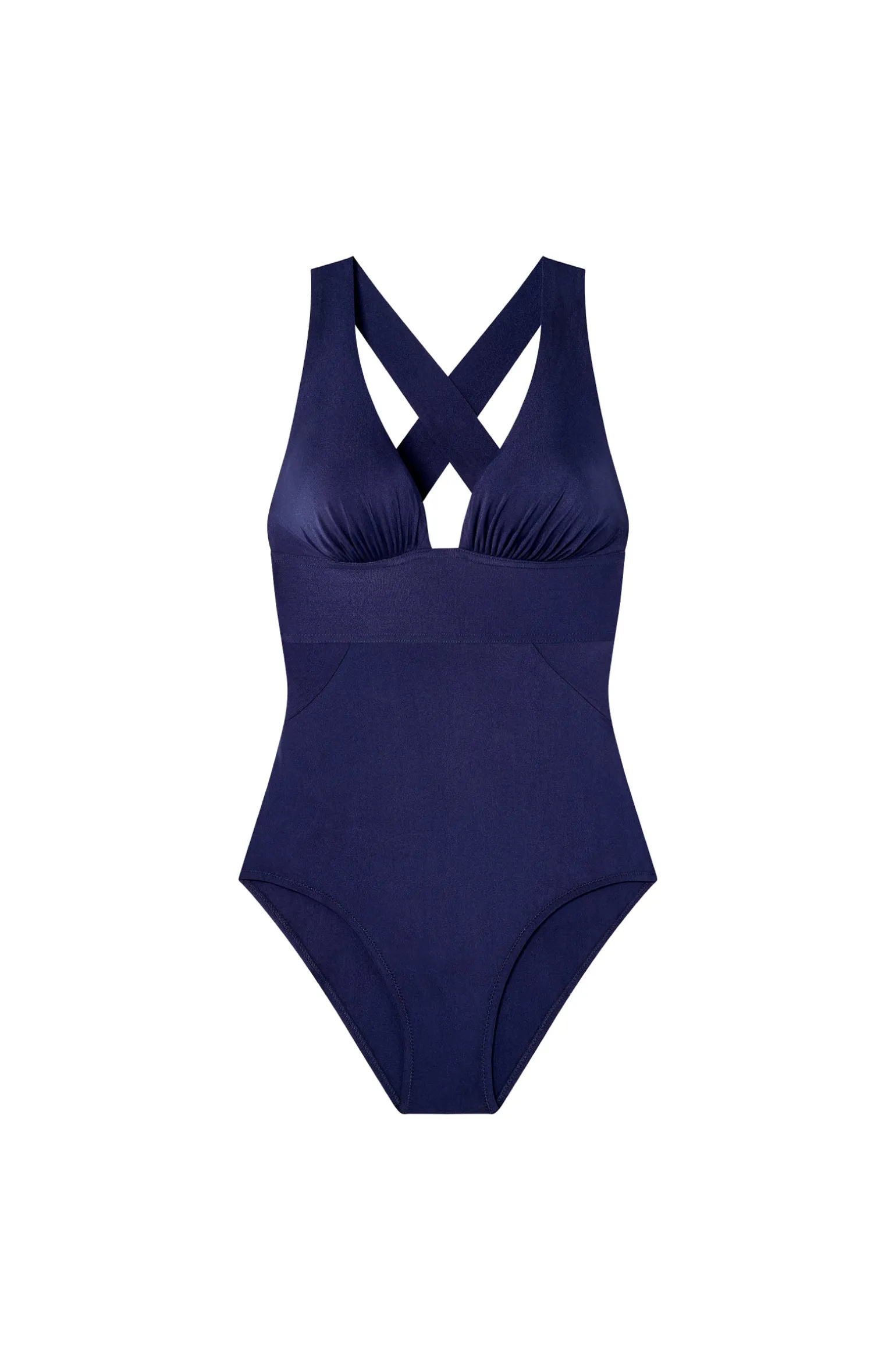 À la frontière entre le body et le maillot de bain, le une-pièce CAPRI est un incontournable. Il assure confort et maintien et ses profonds bonnets drapés subliment toutes les poitrines. Ce maillot nageur aux lignes pures et dynamiques affine la silhouette et galbe les formes. Navy, le bleu des abysses profonds.