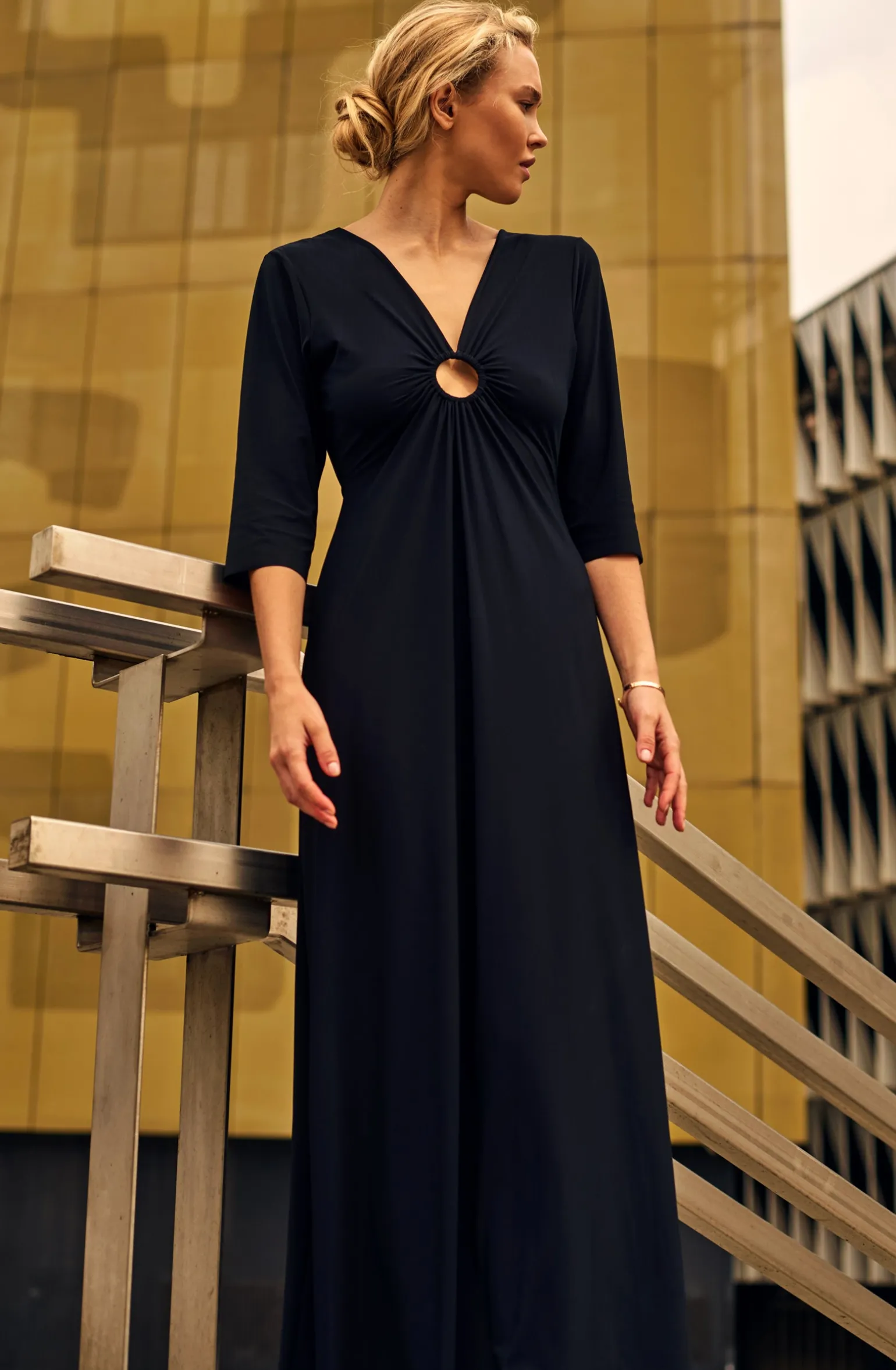 Robe longue manche trois quart avec anneau doré milieu devant