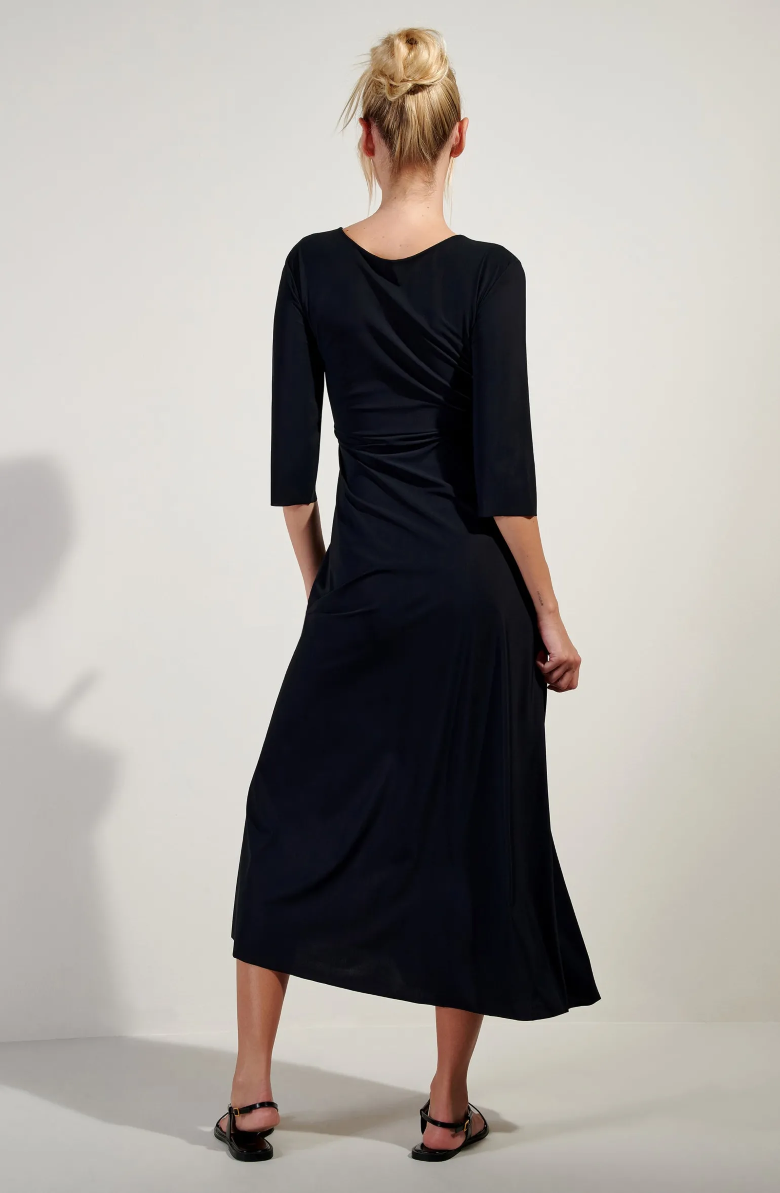 La robe longue CARMEEN couvre la silhouette avec distinction. Pour sublimer le décolleté, le tissu se drape entre-seins autour d’un anneau en zamac doré. Avec ses manches ¾, ce modèle ample et très long se porte devant derrière au gré des envies. Le noir, une couleur intemporelle et toujours élégante.