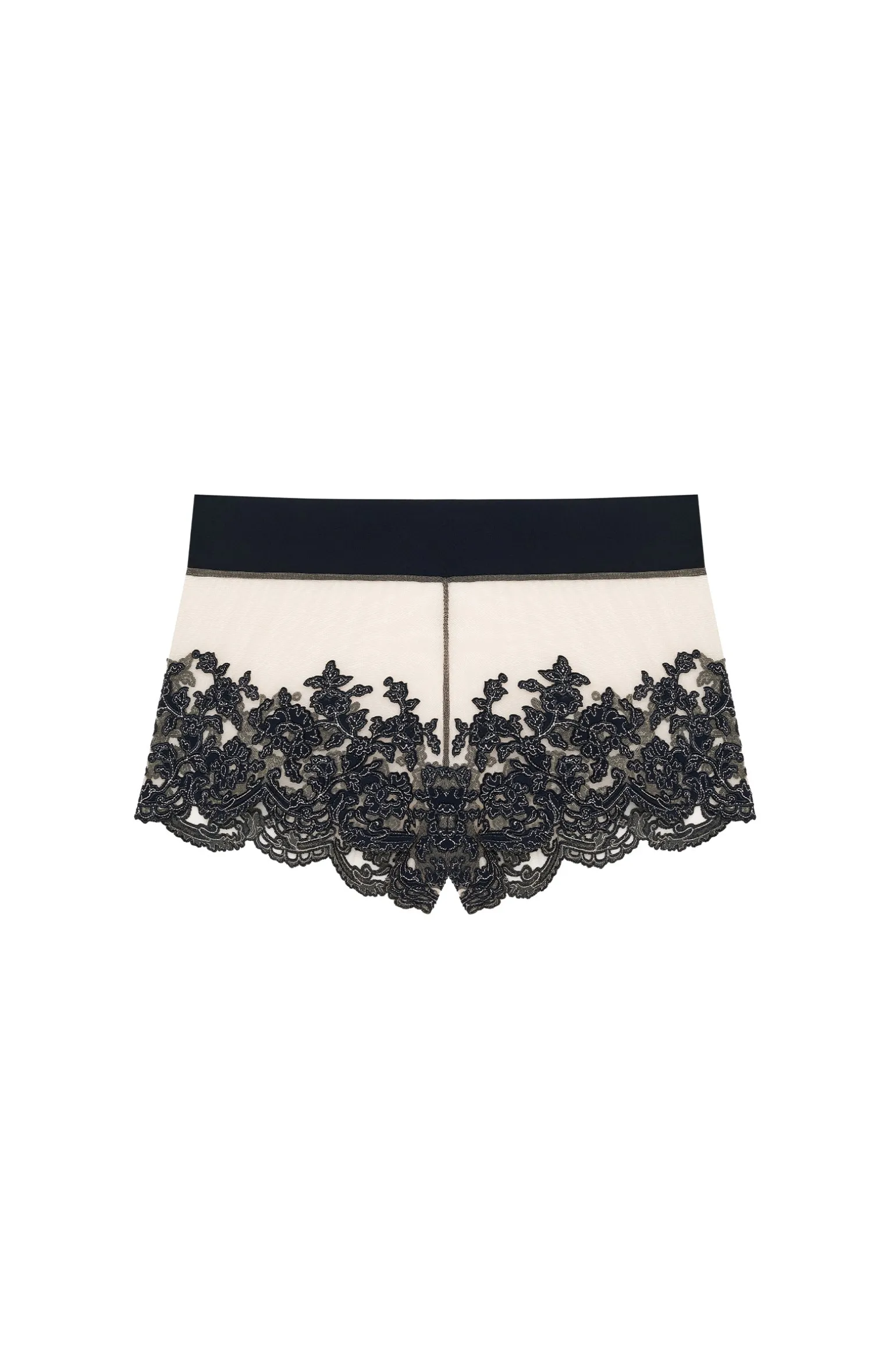 Shorty brodé en tulle transparent, avec frise sur le bas. Finition tour de taille en Bonded.