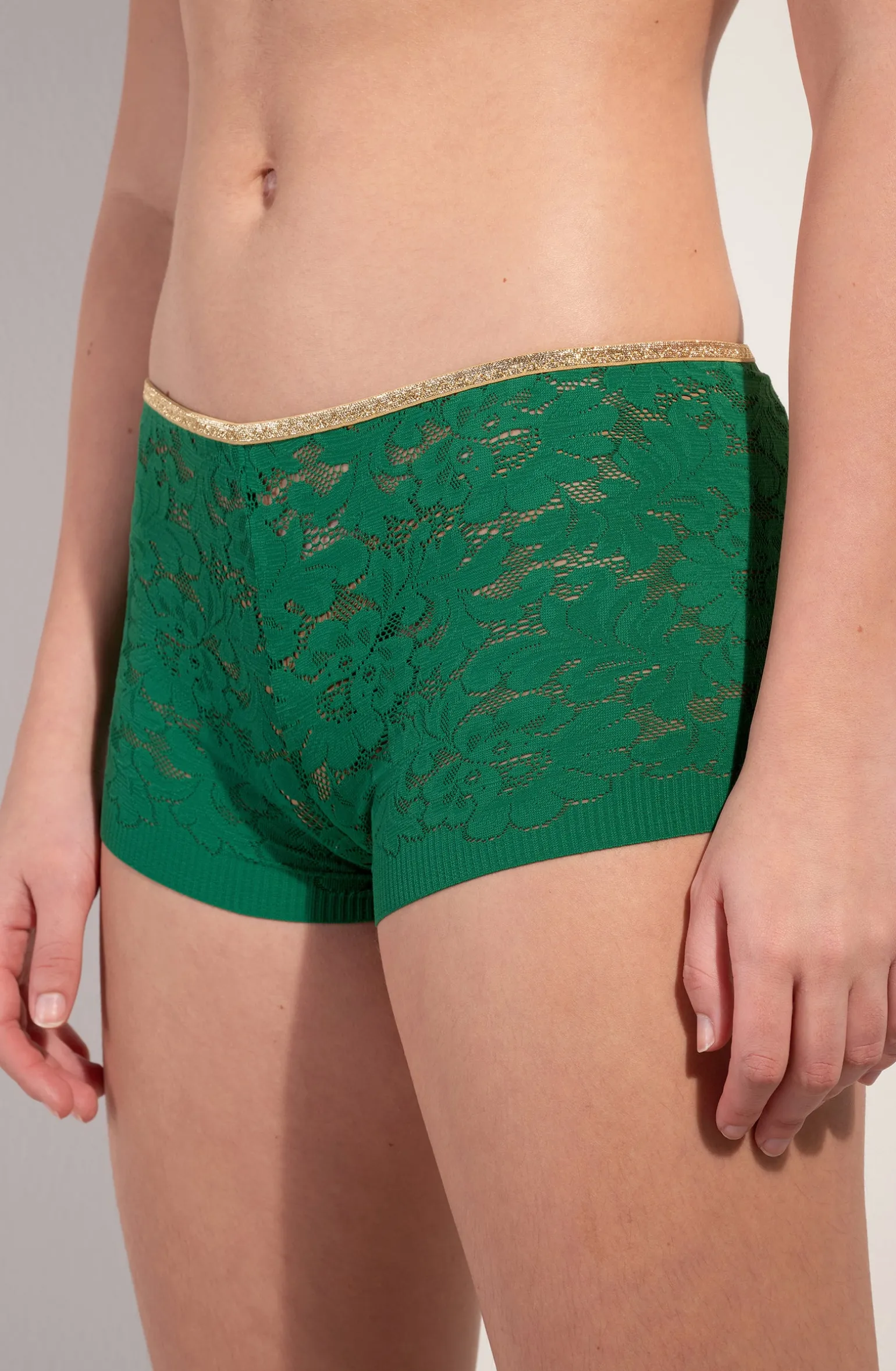 Avec son jeu subtil de matières, le shorty taille haute DYLAN est une pièce iconique de la maison Pain de Sucre. La dentelle française de la culotte se rehausse d’une lumineuse finition en lurex doré pour une allure irréprochable. Jade, un vert prononcé intensément doux et lumineux.