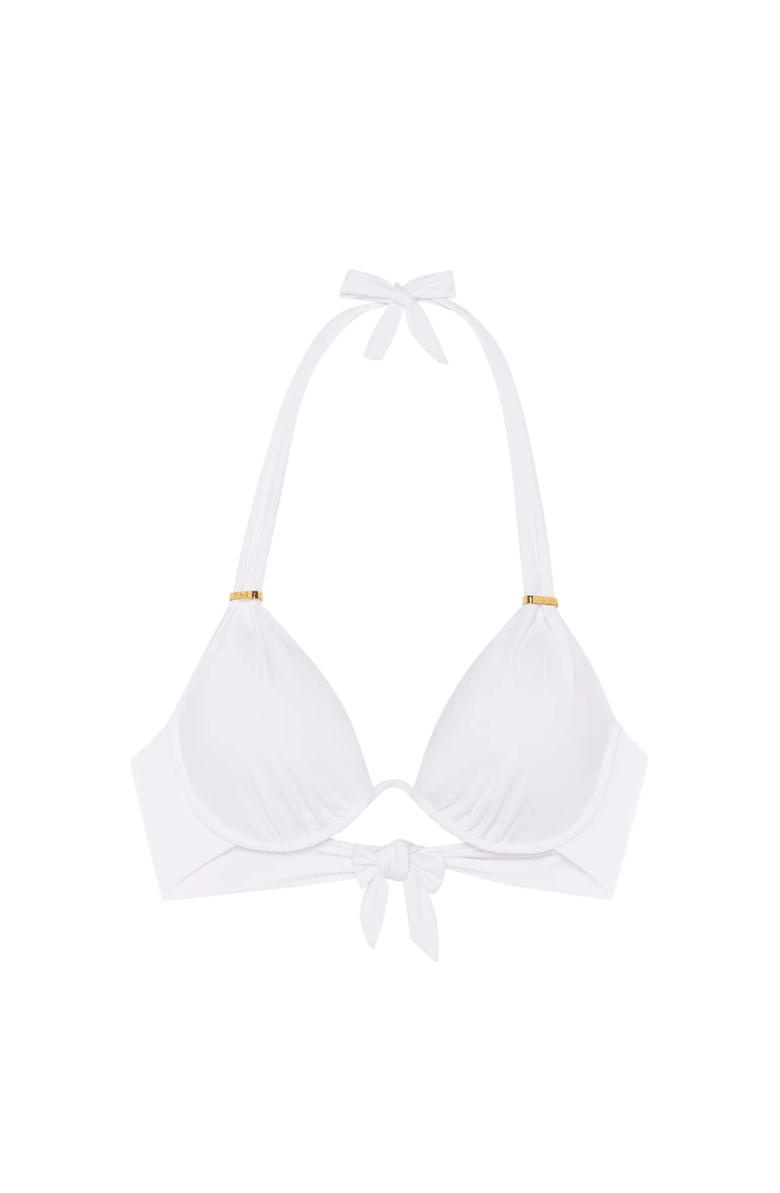 Avec son armature unique, dégagée entre les bonnets, le haut de maillot de bain FABIA est un modèle iconique indémodable. Moderne et raffiné, il se noue dans le dos et derrière la nuque pour s’ajuster parfaitement à la silhouette. Les fronces sous poitrine donnent du relief et les anneaux métalliques le long des bretelles permettent de jouer sur la profondeur du décolleté. Pur et délicat, le blanc illumine le teint.