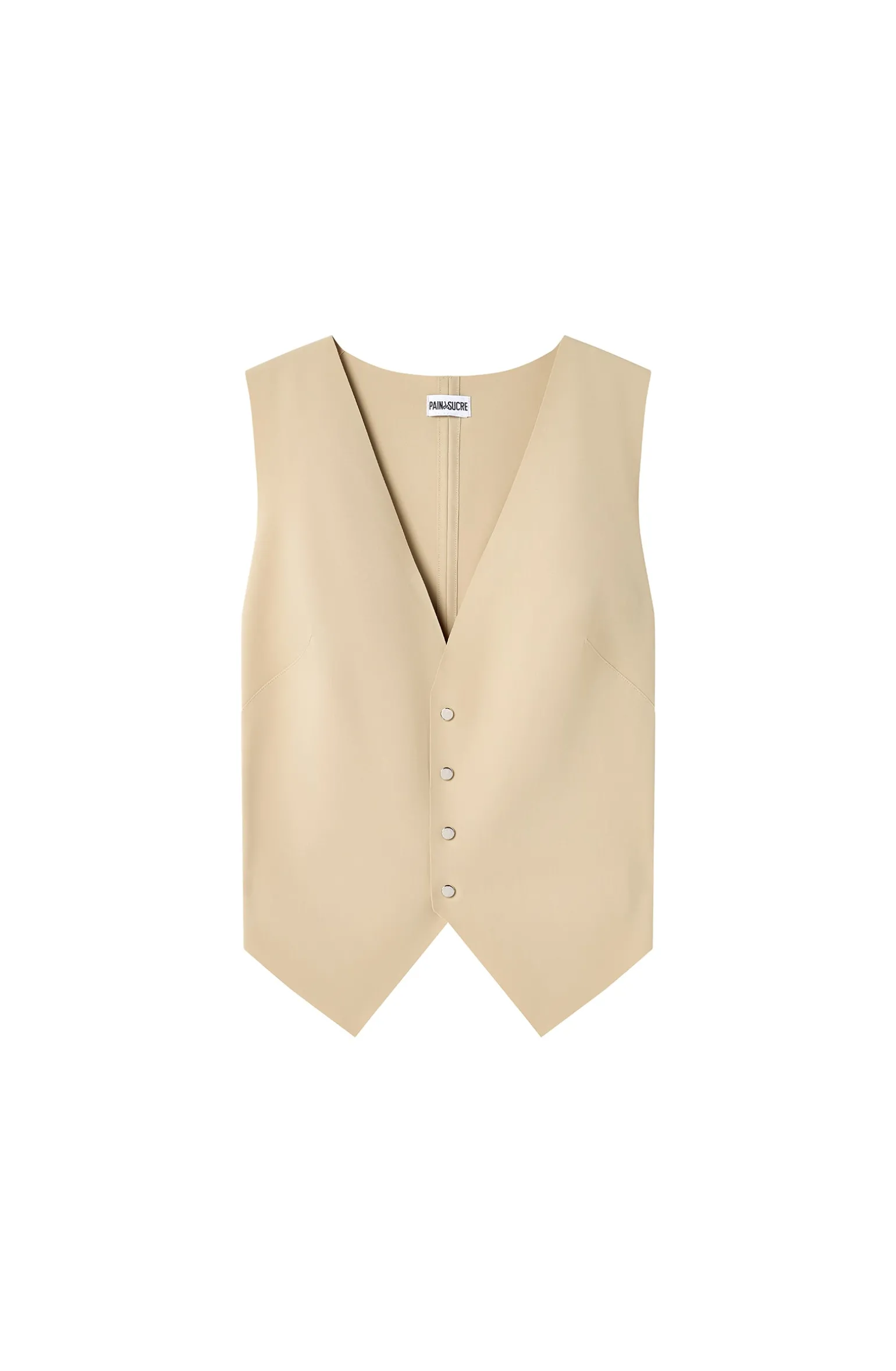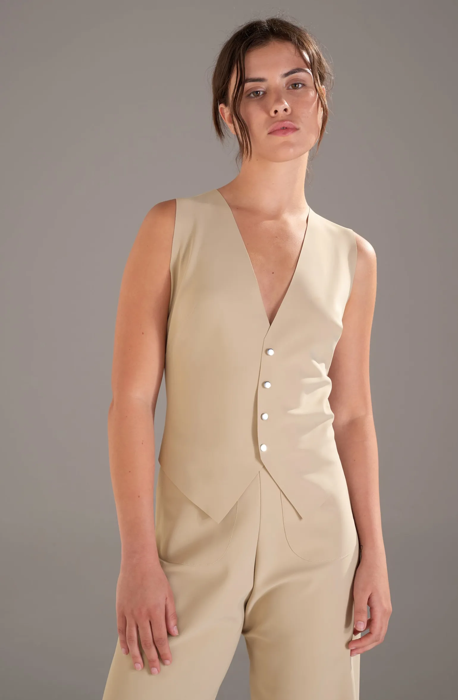 Allure sophistiquée avec le gilet en Bonded GABIE. Inspirant un look féminin masculin, ce top cintré s’ajuste au-devant par de petits boutons amovibles, ton sur ton.