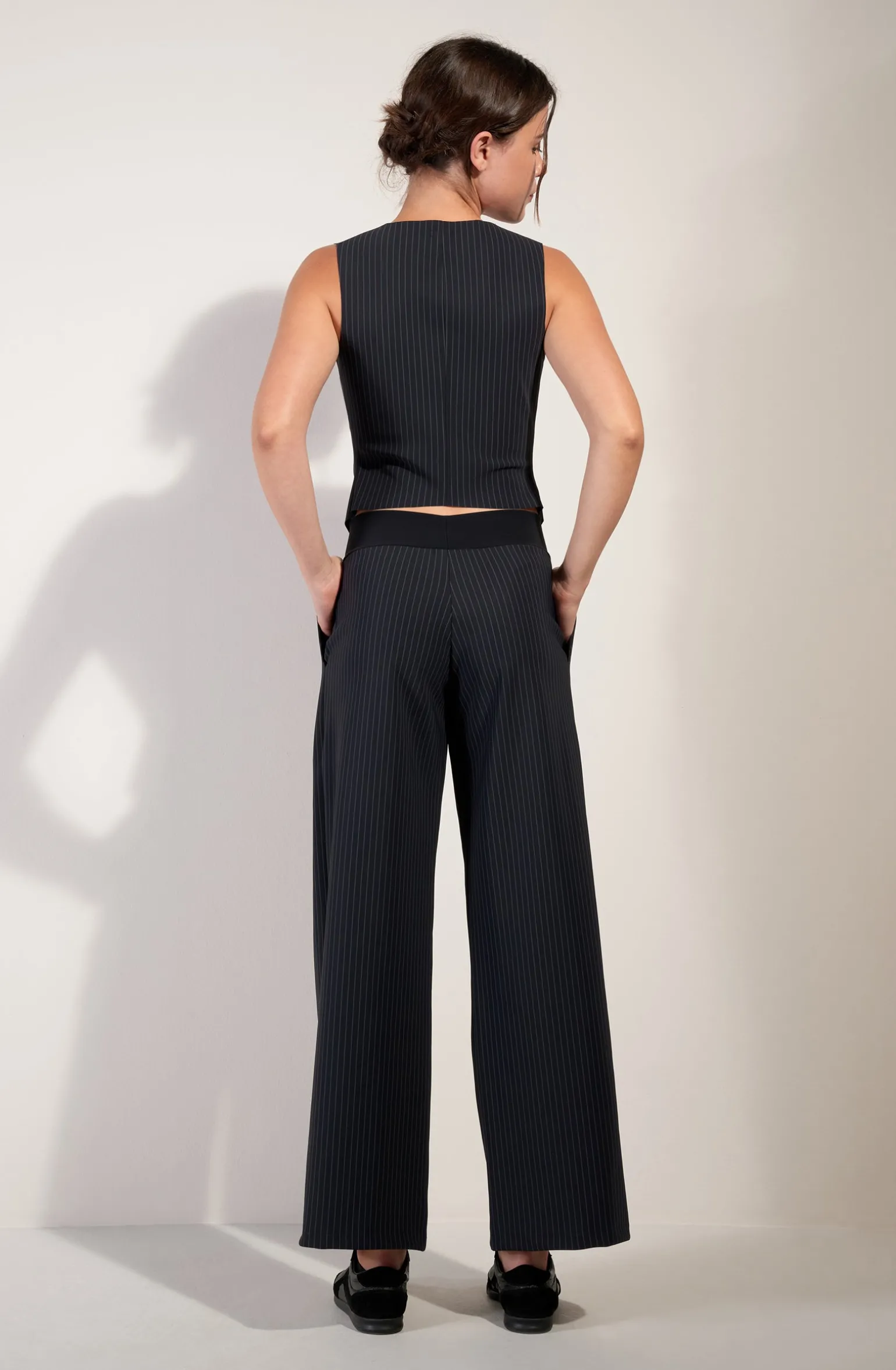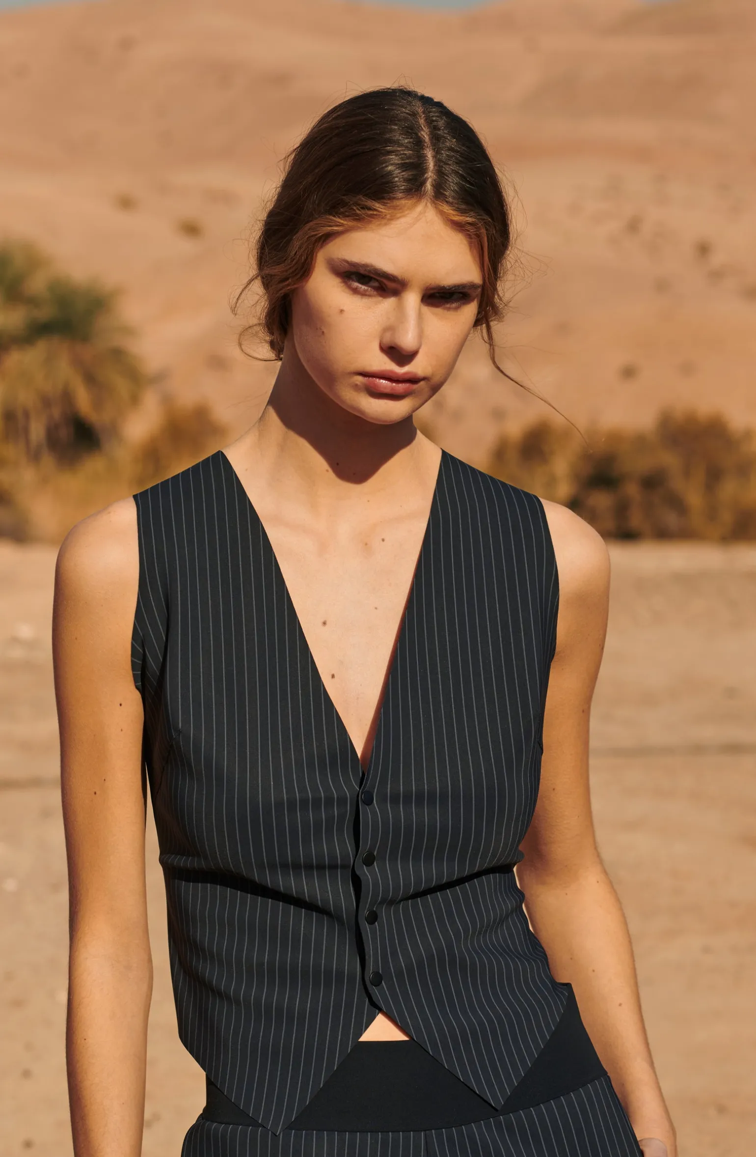 Allure sophistiquée avec le gilet en Bonded GABIE. Inspirant un look féminin masculin, ce top cintré s’ajuste au-devant par de petits boutons amovibles, ton sur ton. Le noir, couleur intemporelle et toujours élégante.