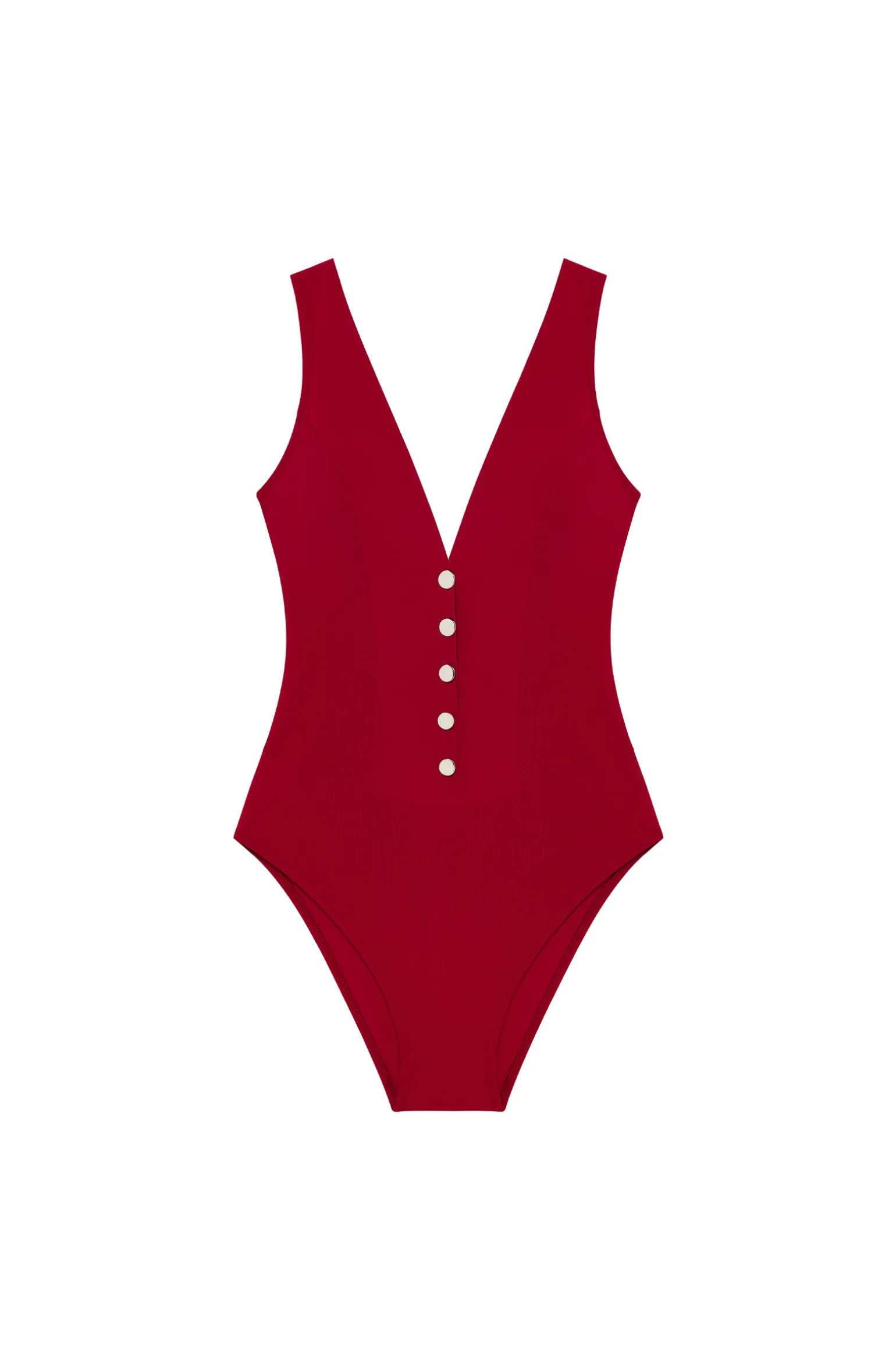 Le nageur GILLIE s’inspire de l’iconique maillot une pièce PIPPER. Cette version se distingue avec ses profonds décolletés en V. Devant, les boutons de manchettes réversibles soulignent la poitrine avec fantaisie et donnent à ce haut une allure de gilet. Garance, un rouge de caractère, nuance écarlate et séductrice.