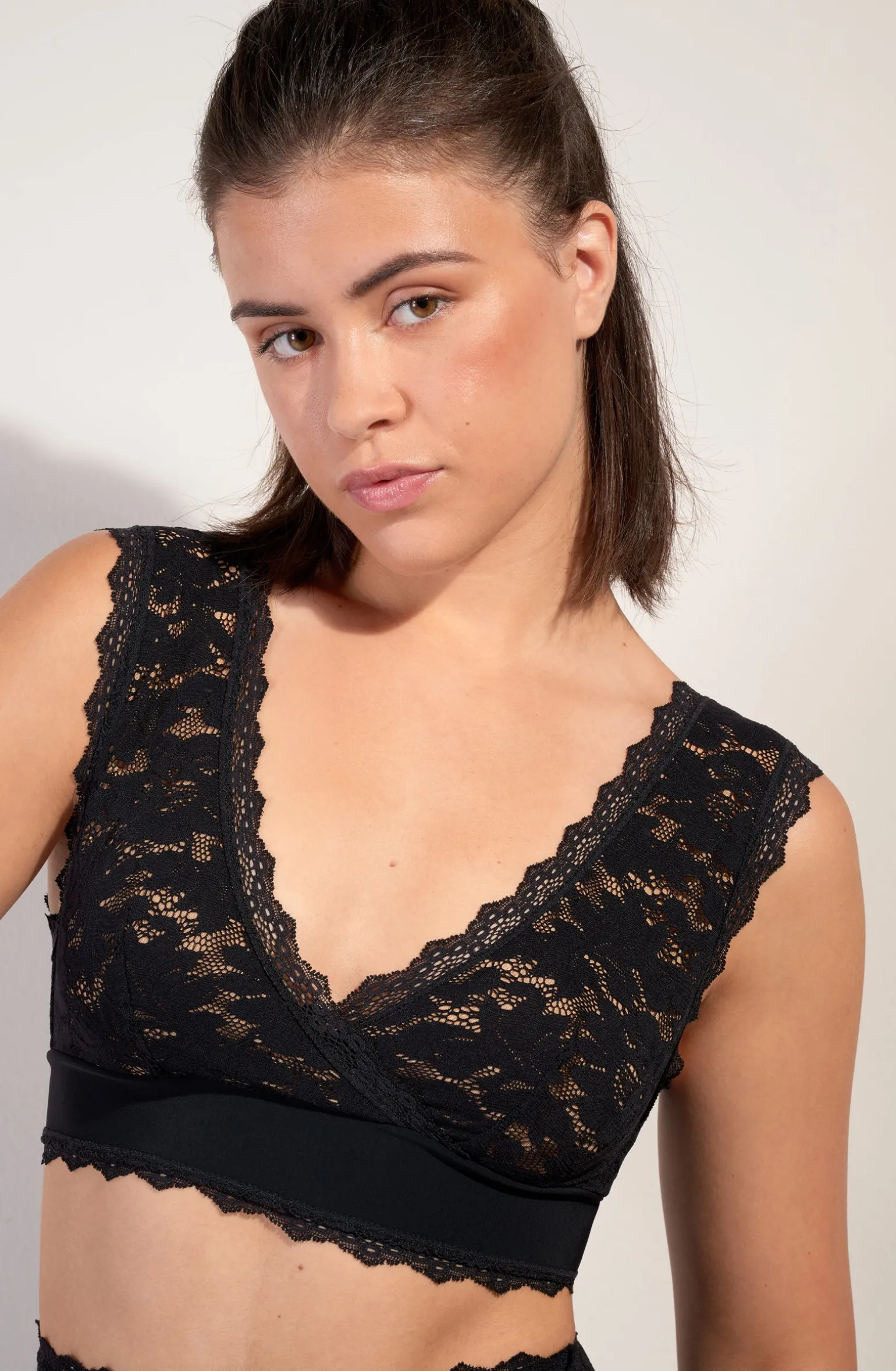 La coupe effet cache-cœur du soutien-gorge Girby lui donne une allure de crop top. Sous poitrine, une large bande en bonded maintient le décolleté. Entièrement doublé de tulle, la dentelle française épouse les formes avec raffinement. Le noir, une couleur intemporelle et toujours élégante.