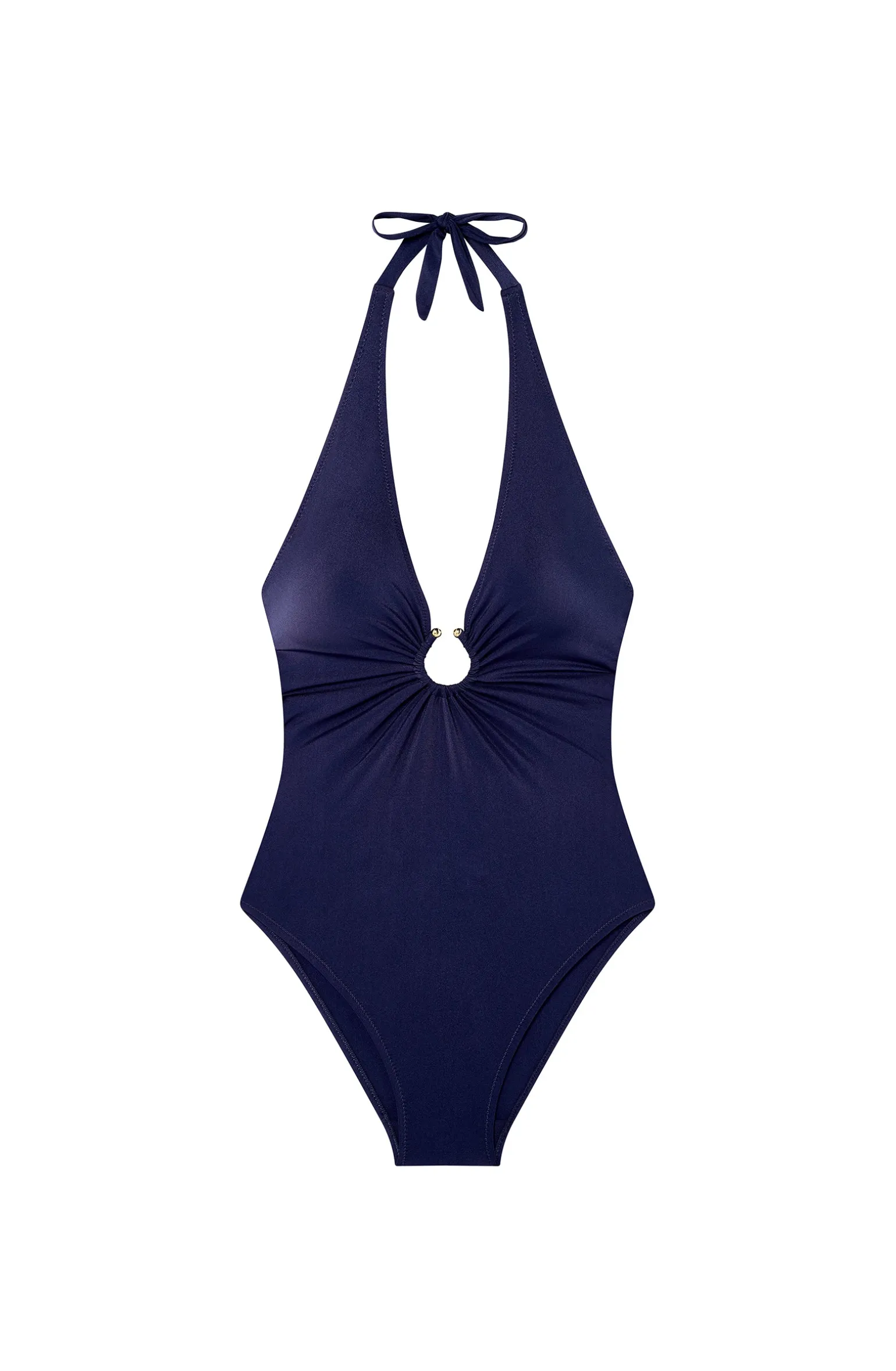 Avec sa coupe échancrée, le maillot de bain LEVEN se pare de profonds décolletés devant et dans le dos qui se drapent élégamment autour d’un bijou en zamac doré. Ce jeu de fronces affine les formes avec distinction. Navy, le bleu des abysses profonds.