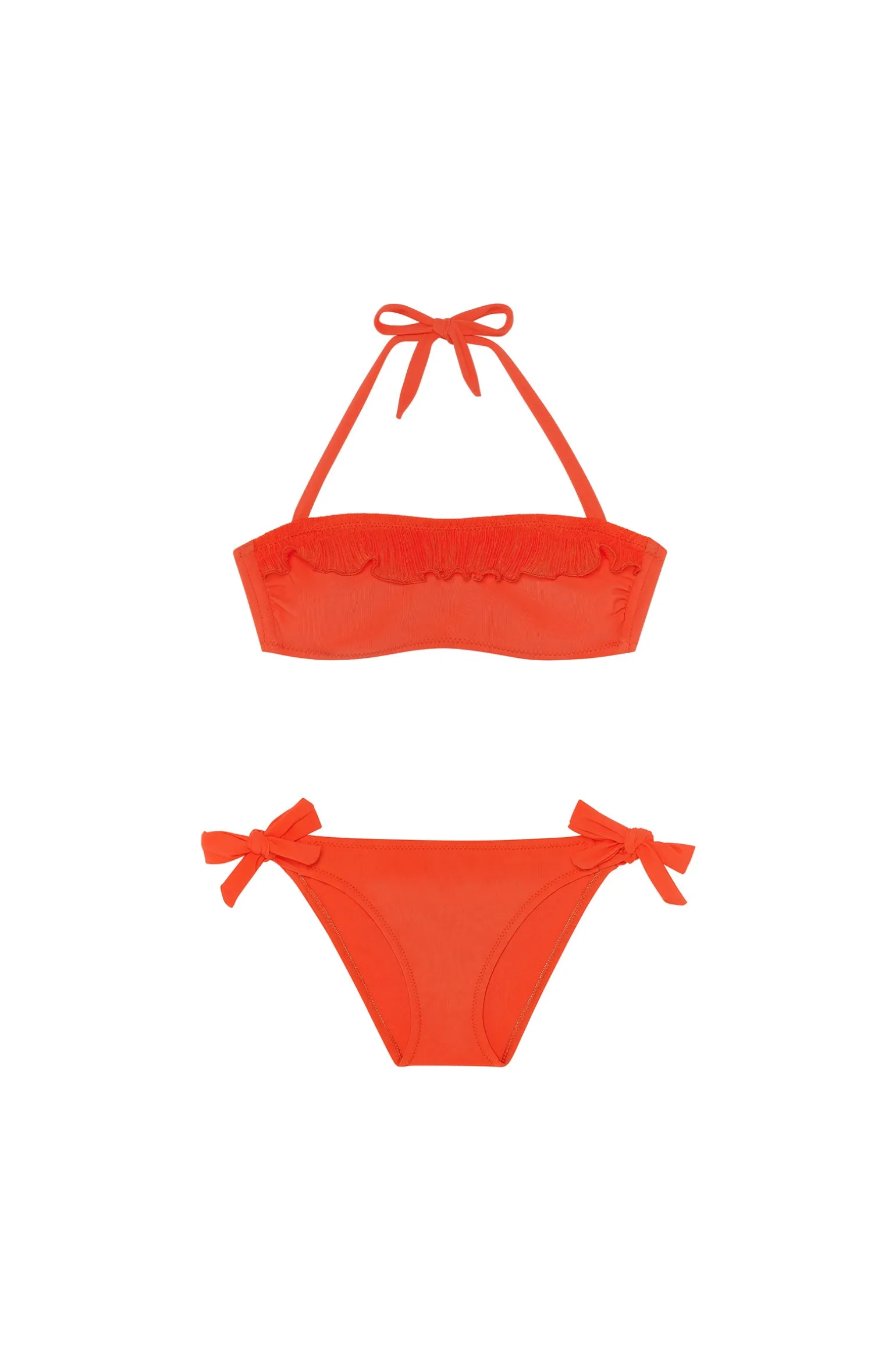 La brassière et la culotte de bain du maillot 2 pièces LOUNA pour enfant se parent de volants en mousseline plissée. Le bas se noue sur les côtés pour s’ajuster à la taille et le haut s’attache derrière la nuque. Un orange moderne, intensément vitaminé.