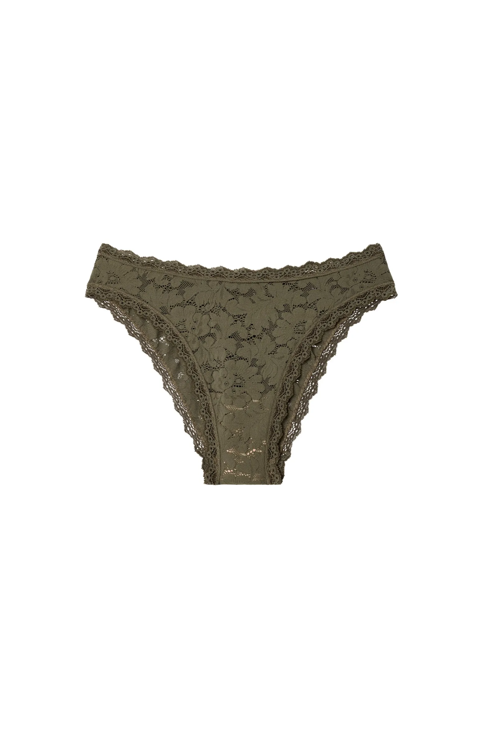 La culotte MAILI en fine dentelle transparente révèle la peau en délicatesse et couvre de douceur et de confort. La coupe échancrée affine la silhouette. Lichen, une teinte organique, vert kaki.