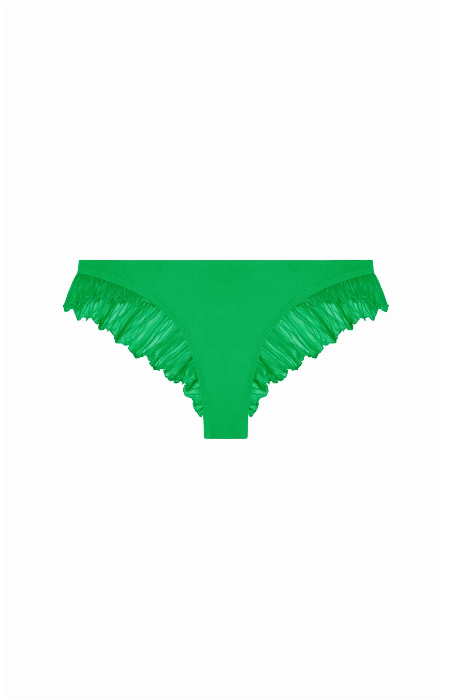 Modèle iconique de la maison Pain de Sucre, le bas de maillot de bain string MALALA célèbre la féminité avec grâce. Ses larges volants en voile plissé coordonné, sur l’arrière et les côtés, sculptent une silhouette affirmée. Pomme, un vert lumineux et pétillant.