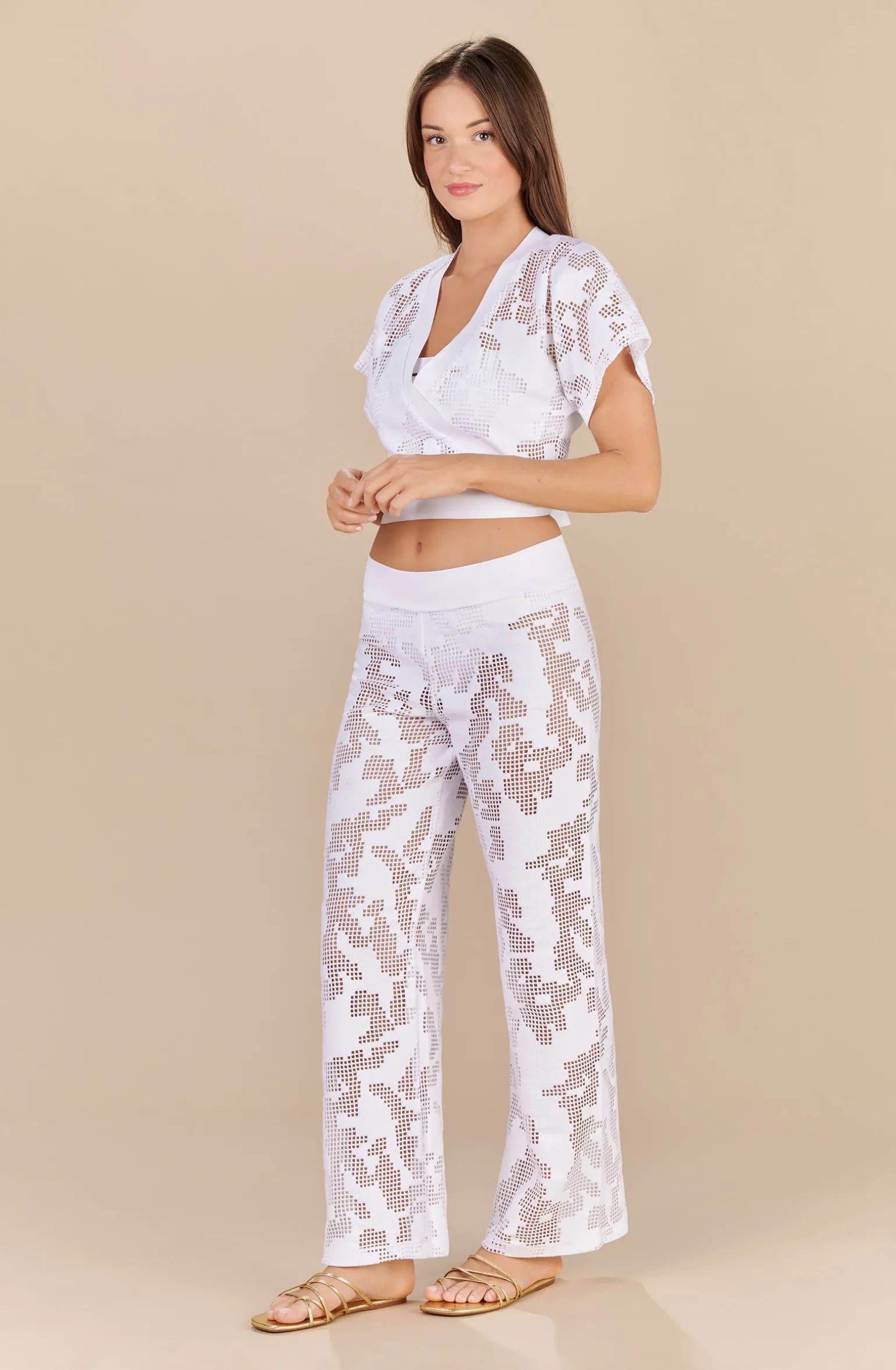 Notre cache-cœur blanc MANOA forme un ensemble parfait avec le pantalon ample PHYBIE. On se couvre de leur résille ajourée pour une tenue légère toute en transparence. Dessous, on enfile notre bikini. Résolument moderne et glamour, on se pare de la culotte de bain VINY et du bandeau WAVE. On est totalement charmée par les découpes free cut que de petits bijoux viennent joliment refermer. Toujours en blanc, on coordonne le bas et le haut DIVA pour un ensemble plus classique mais pas moins chic.