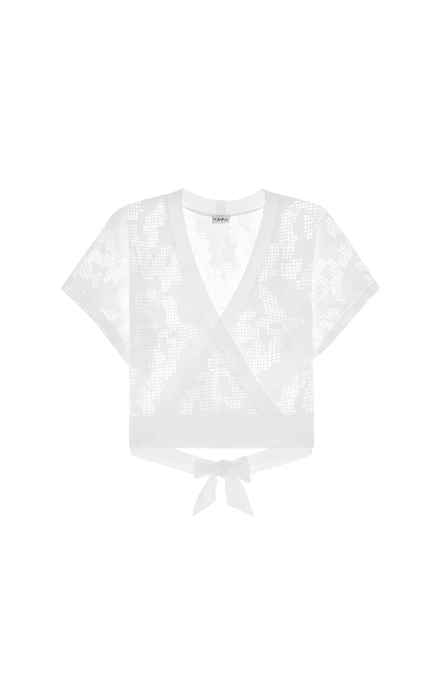 Top cache-coeur en résille ajourée. Larges manches courtes. Bande de finition en « bonded » sur le décolleté. Large ceinture en « bonded » nouée dos.