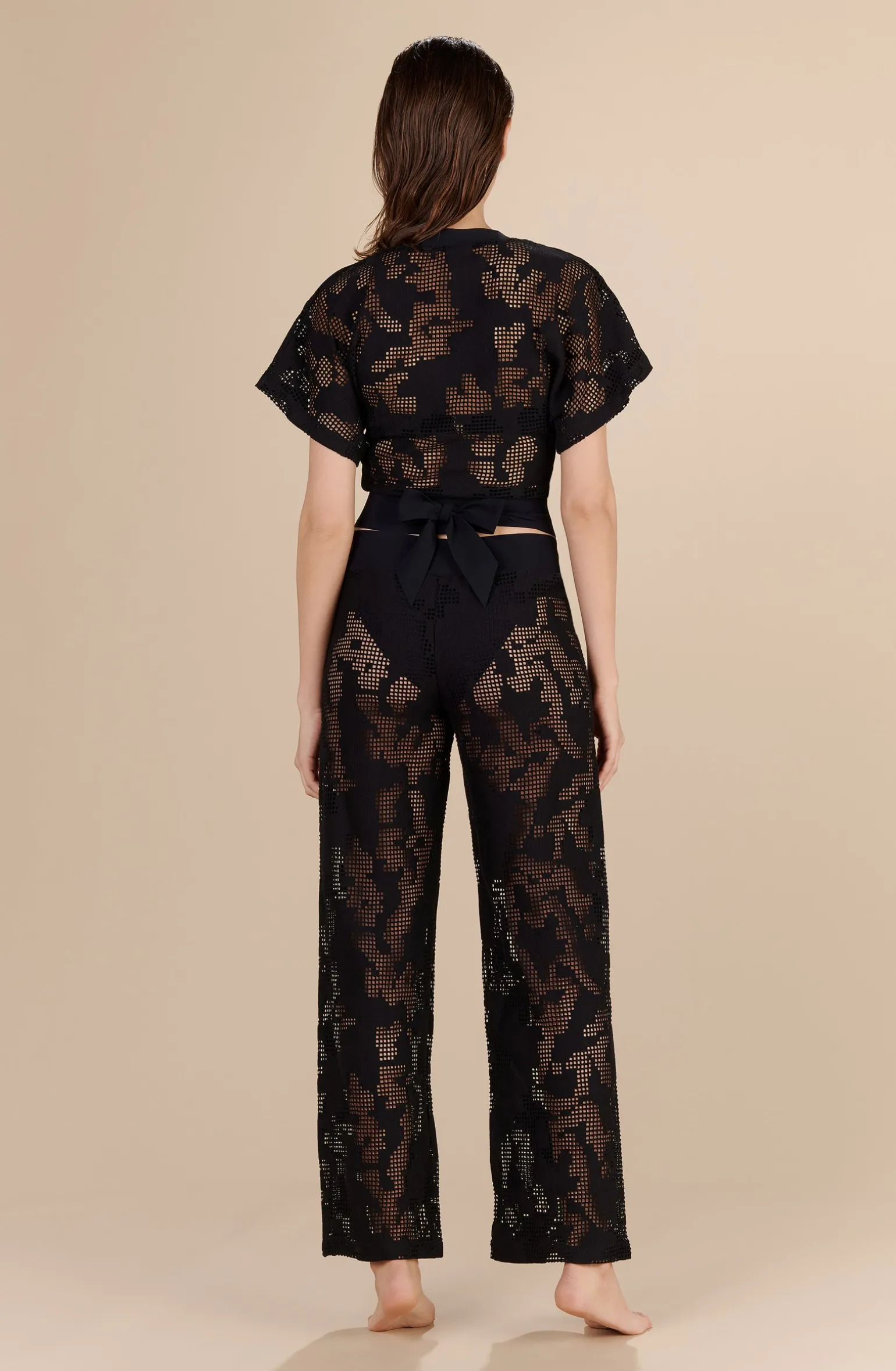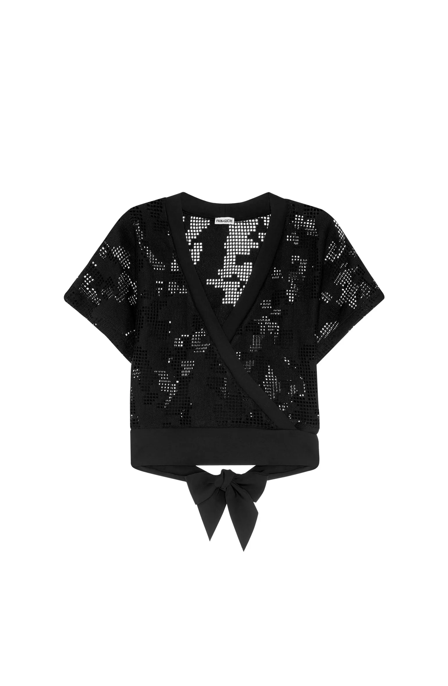 Top cache-coeur en résille ajourée. Larges manches courtes. Bande de finition en « bonded » sur le décolleté. Large ceinture en « bonded » nouée dos.