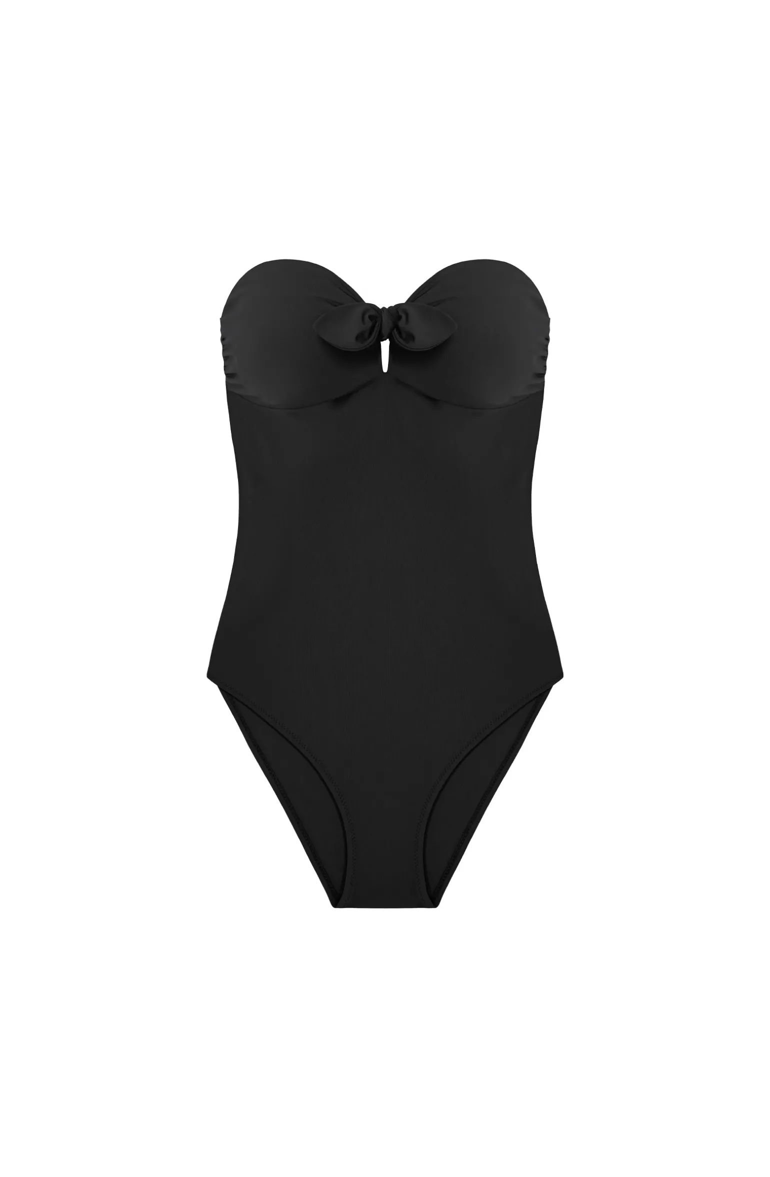 le maillot une-pièce bustier MAO offre une silhouette toute en élégance. Simple et délicatement échancré, il ravit pour son confort et s’ajuste à toutes les morphologies grâce au nœud entre-seins. Le noir, une couleur intemporelle et toujours élégante.