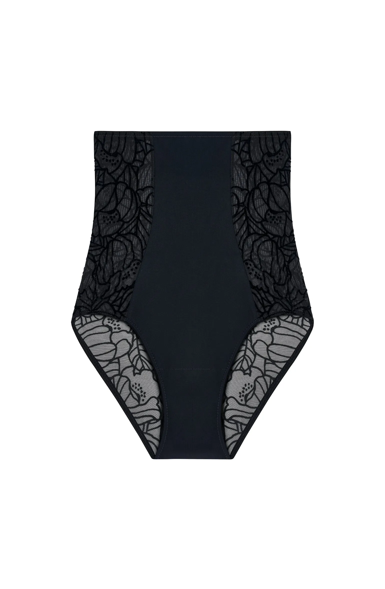 La culotte taille haute Nel, aux accents rétro, combine les matières emblématiques de la maison Pain De Sucre. La dentelle délicatement fleurie s’associe au bonded pour assurer le confort et affiner la silhouette. Le noir, une couleur intemporelle et toujours élégante.