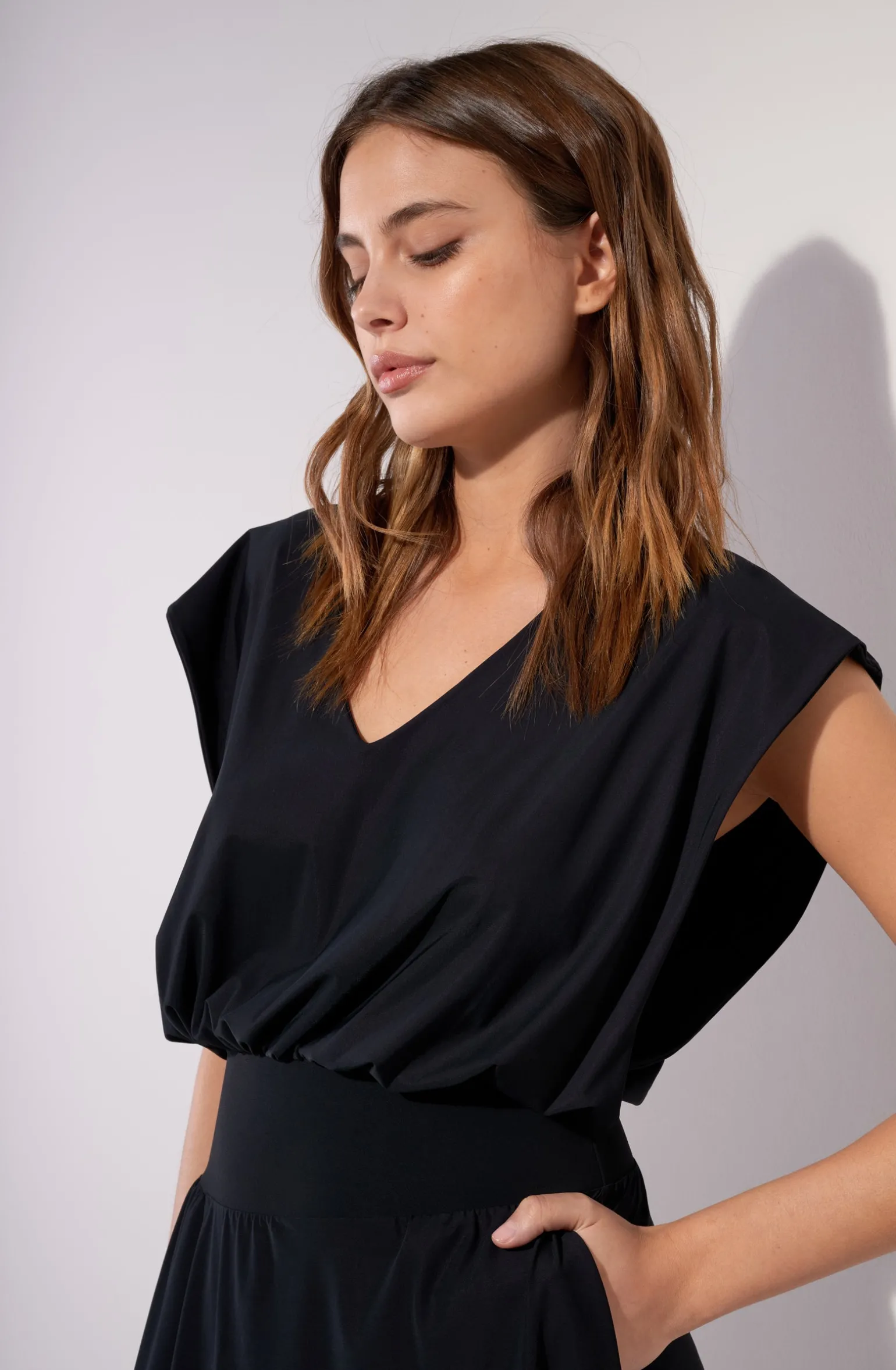 - Haut ample en double matière multi-positions : décolleté V, croisé ou asymétrique
