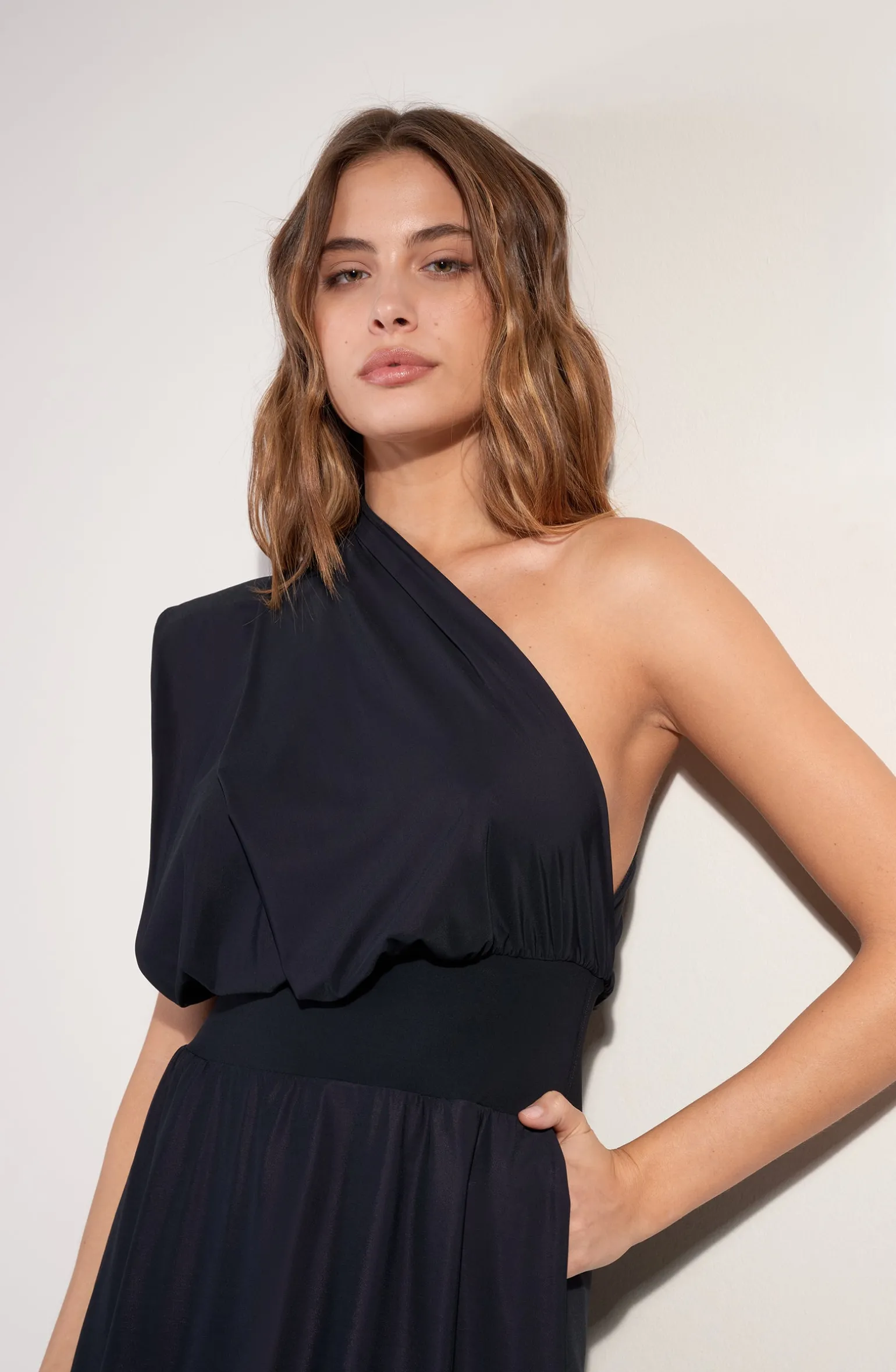 La robe courte NOLA se porte en toute occasion, changeant de style en un tour de manche. Pour une silhouette décontractée, le haut se porte ample, les manches sur les épaules. Elles s’entrecroisent pour une tenue plus sophistiquée, ou se portent de façon asymétrique pour une allure libre et affirmée. Le noir, couleur intemporelle, toujours élégante.