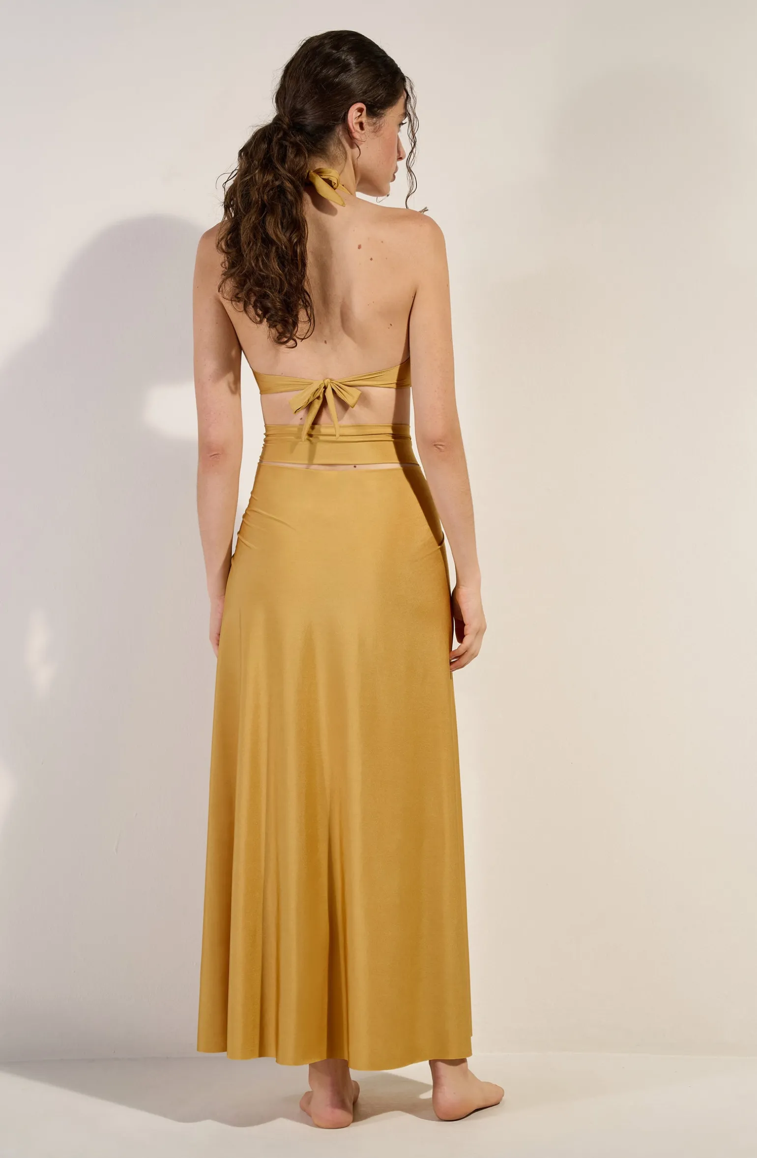 Agrémentée d’un anneau bijou, la jupe paréo PETRA change de style avec élégance. Version jupe, ses lanières s’attachent joliment autour de la taille. Elles se nouent autour des épaules pour une robe de plage bustier à l’allure très féminine. Gold, un jaune doré solaire.