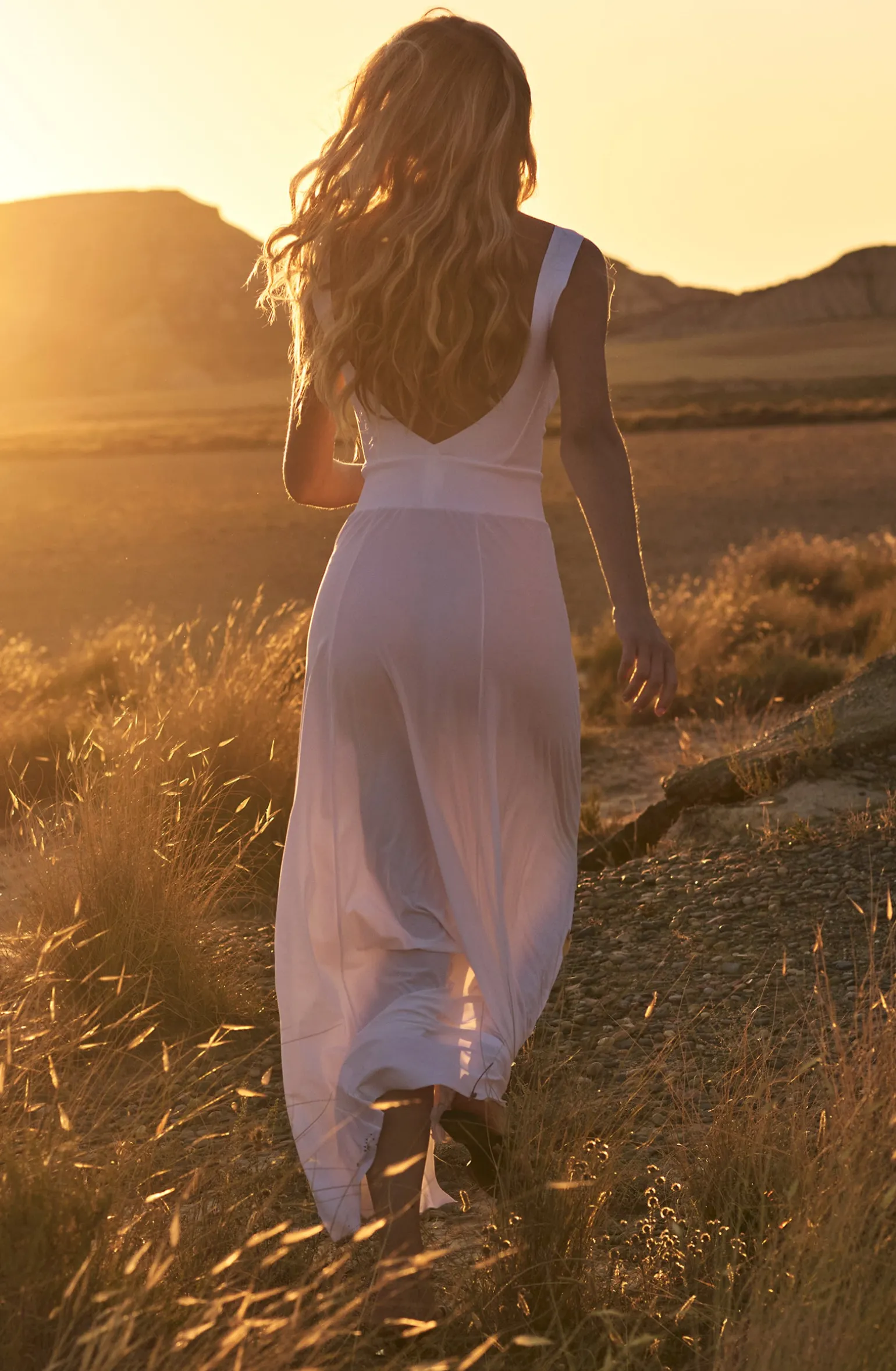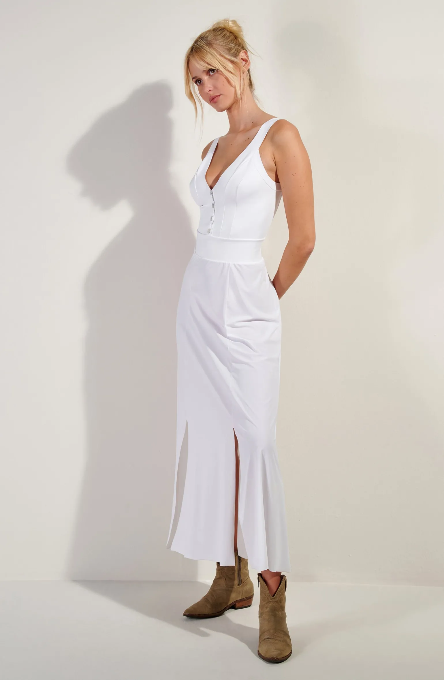 Le haut de la robe longue RALIA s’inspire des iconiques maillots de bain nageur de la maison Pain de Sucre. Profondément décolletée, cette robe se pare de boutons de manchettes réversibles. Détail sophistiqué qui sublime les formes avec fantaisie et souligne la féminité. Pur et délicat, le blanc illumine le teint.