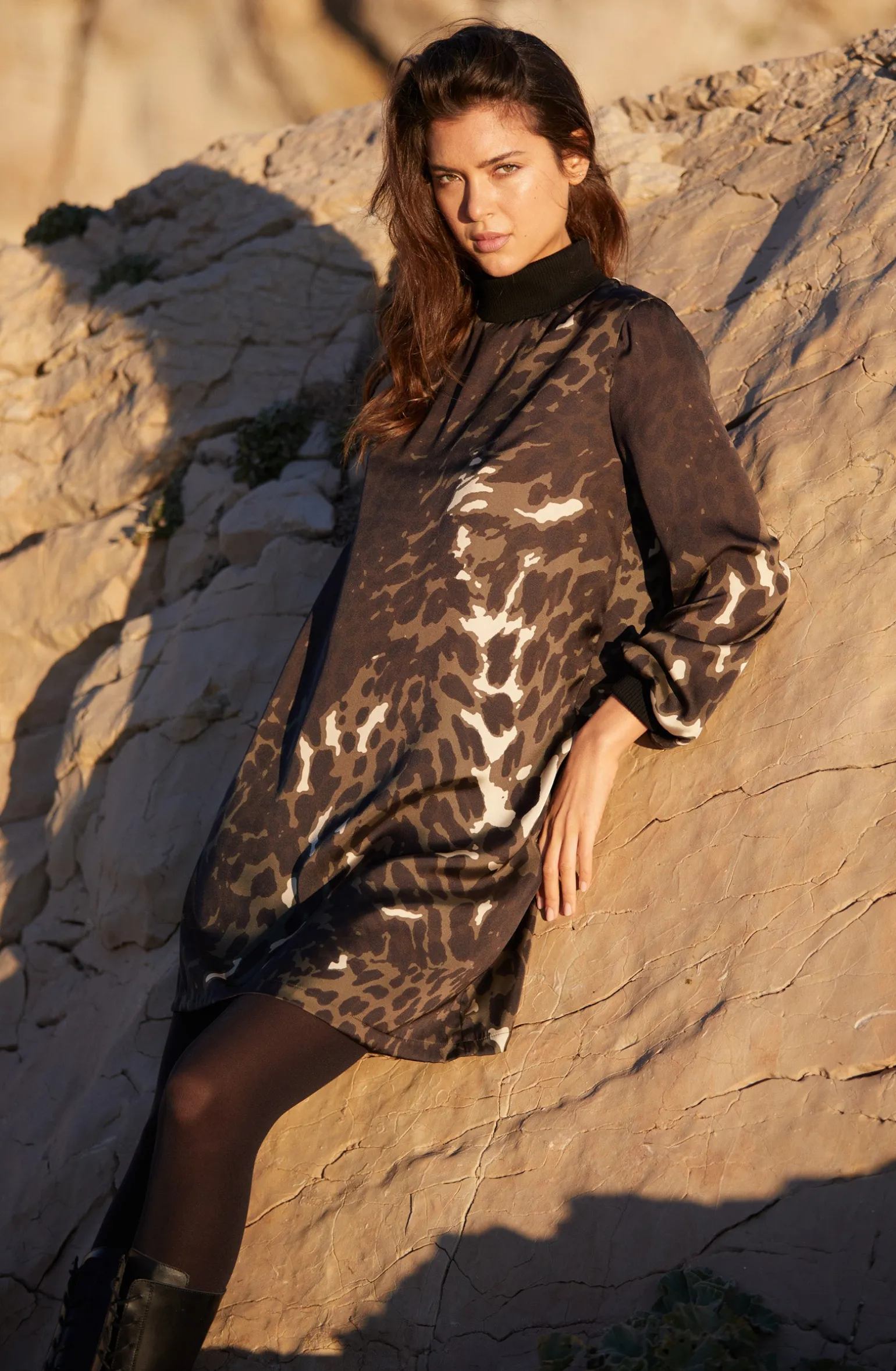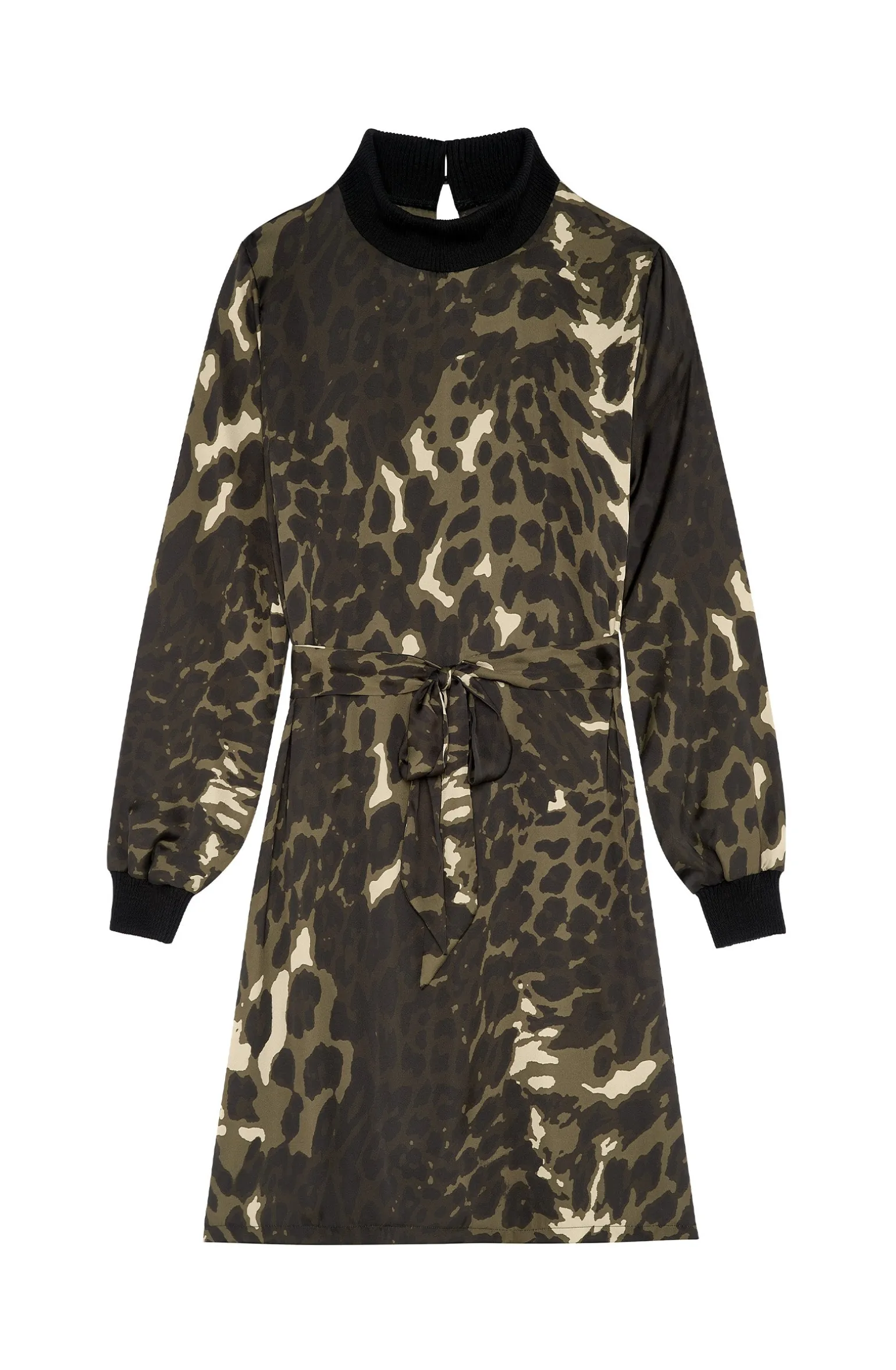 Contraste et mélange des matières, le satin fluide s’ourle de finitions en bord-côte au niveau du col et des poignets. La robe REBECCA joue des volumes avec style. Son imprimé JUNGLE se noue à la taille dans un esprit working-girl ou se porte en toute liberté.