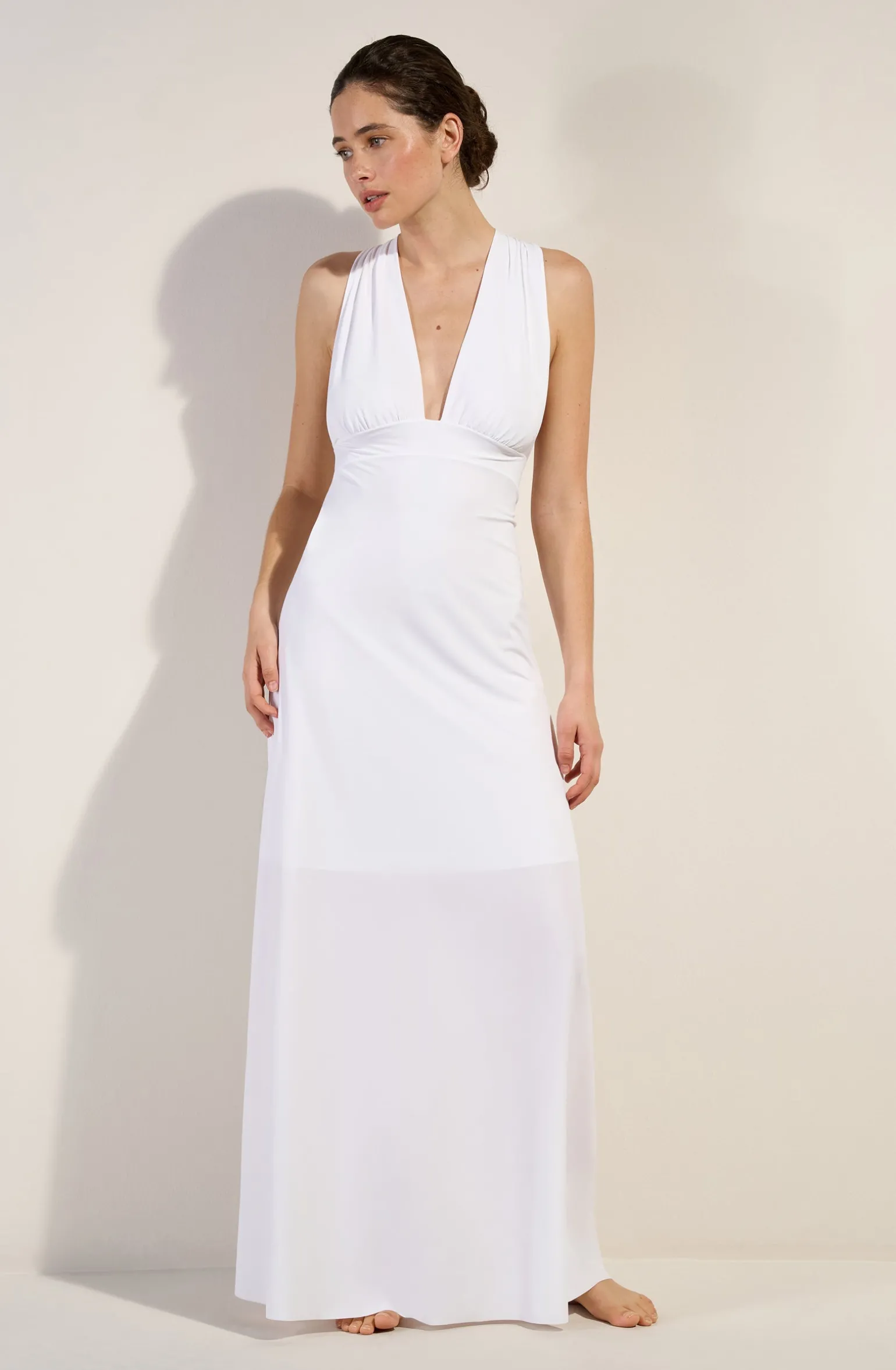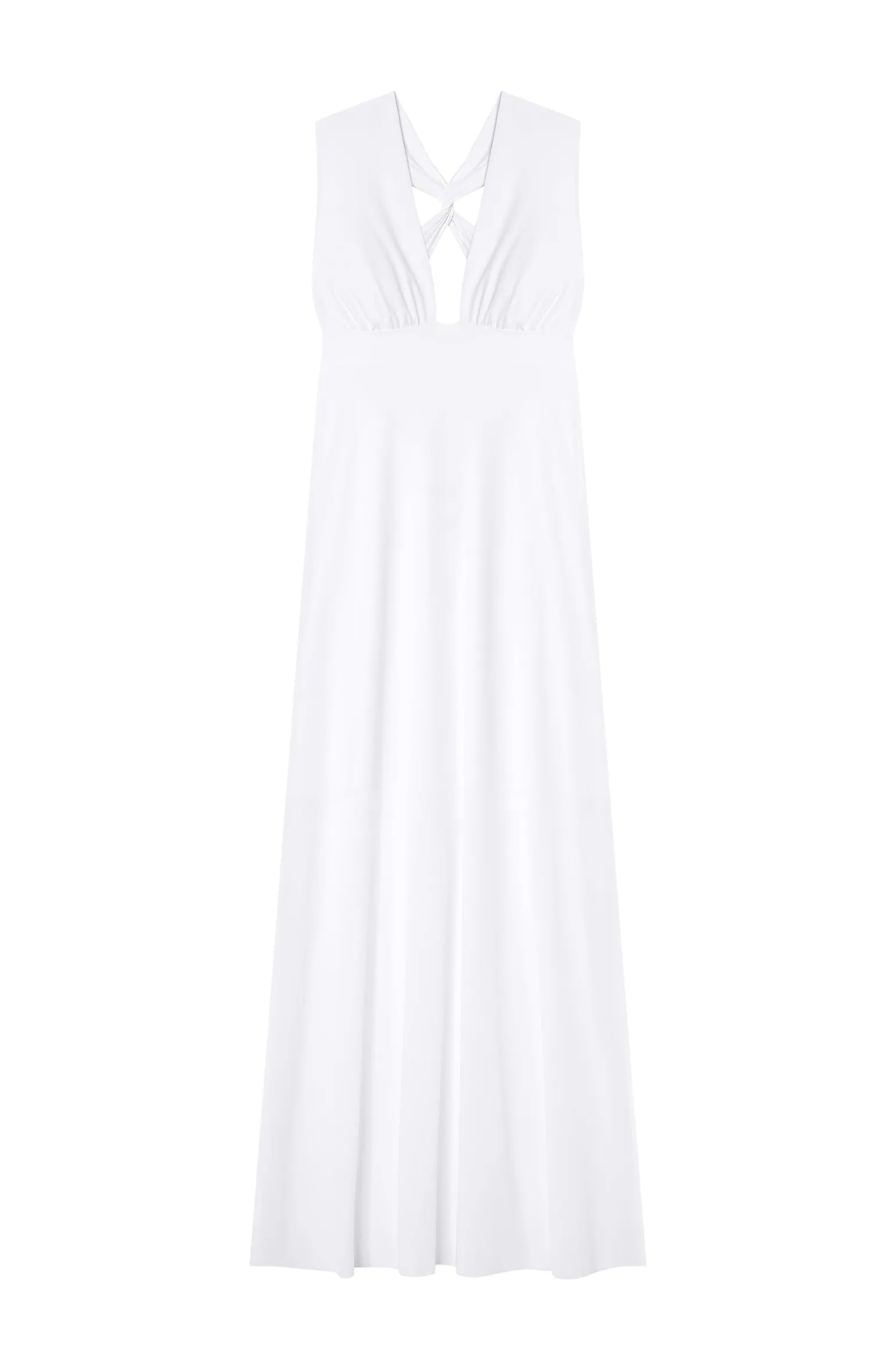 Avec ses lignes pures et dynamiques, la robe longue fluide REENA affine la silhouette et galbe les formes. Devant les larges bonnets froncés mettent en valeur le décolleté. Derrière, les bretelles croisées s’ajustent pour sublimer le dos nu. Pur et délicat, le blanc illumine le teint.