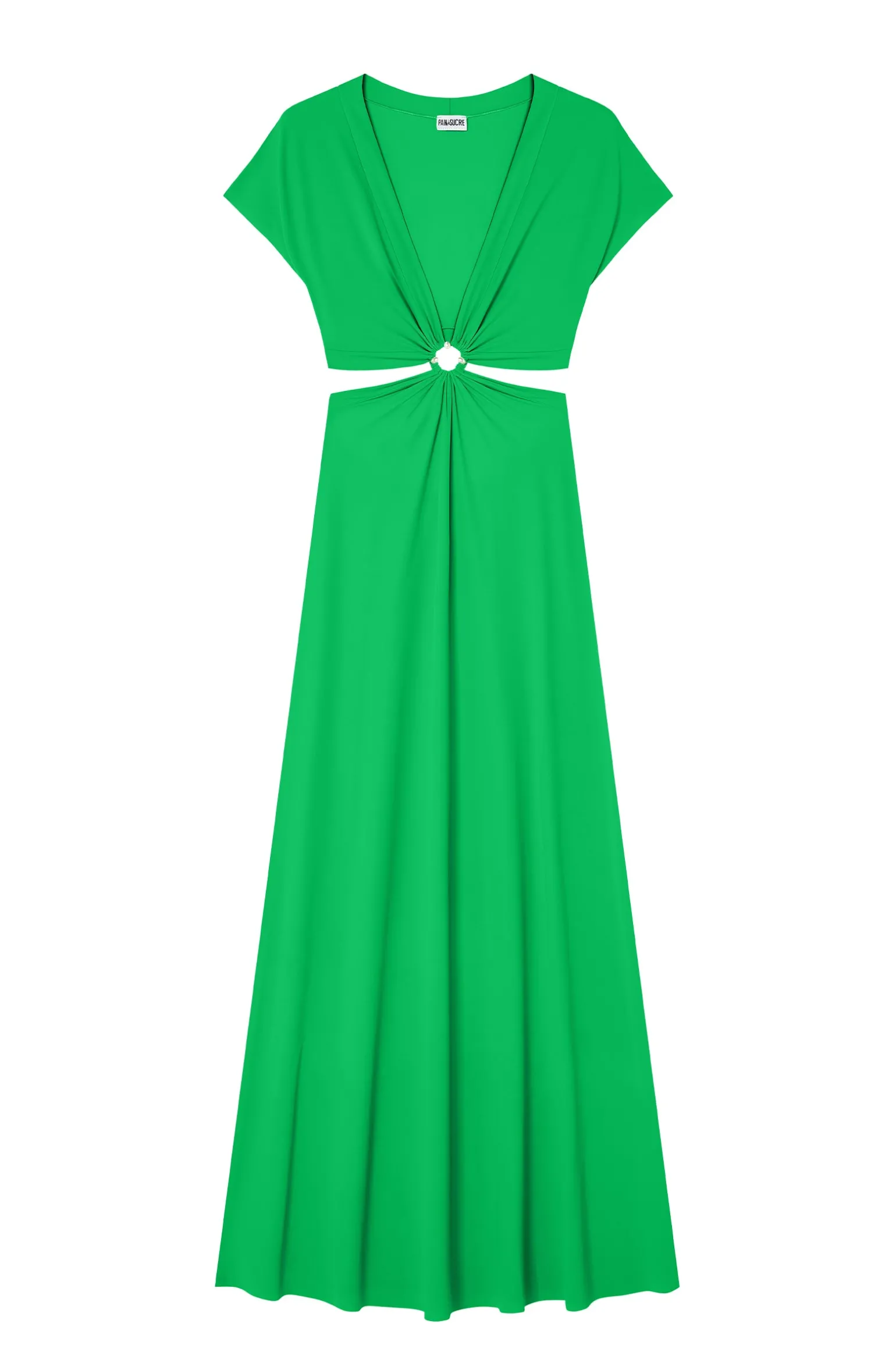 La robe longue échancrée RISLENE offre une allure moderne et audacieuse. Son haut à manches courtes se drape autour d’un ajour, dévoilant trois perles nacrées et se prolonge en une longue jupe fluide. Pomme, un vert lumineux et pétillant.
