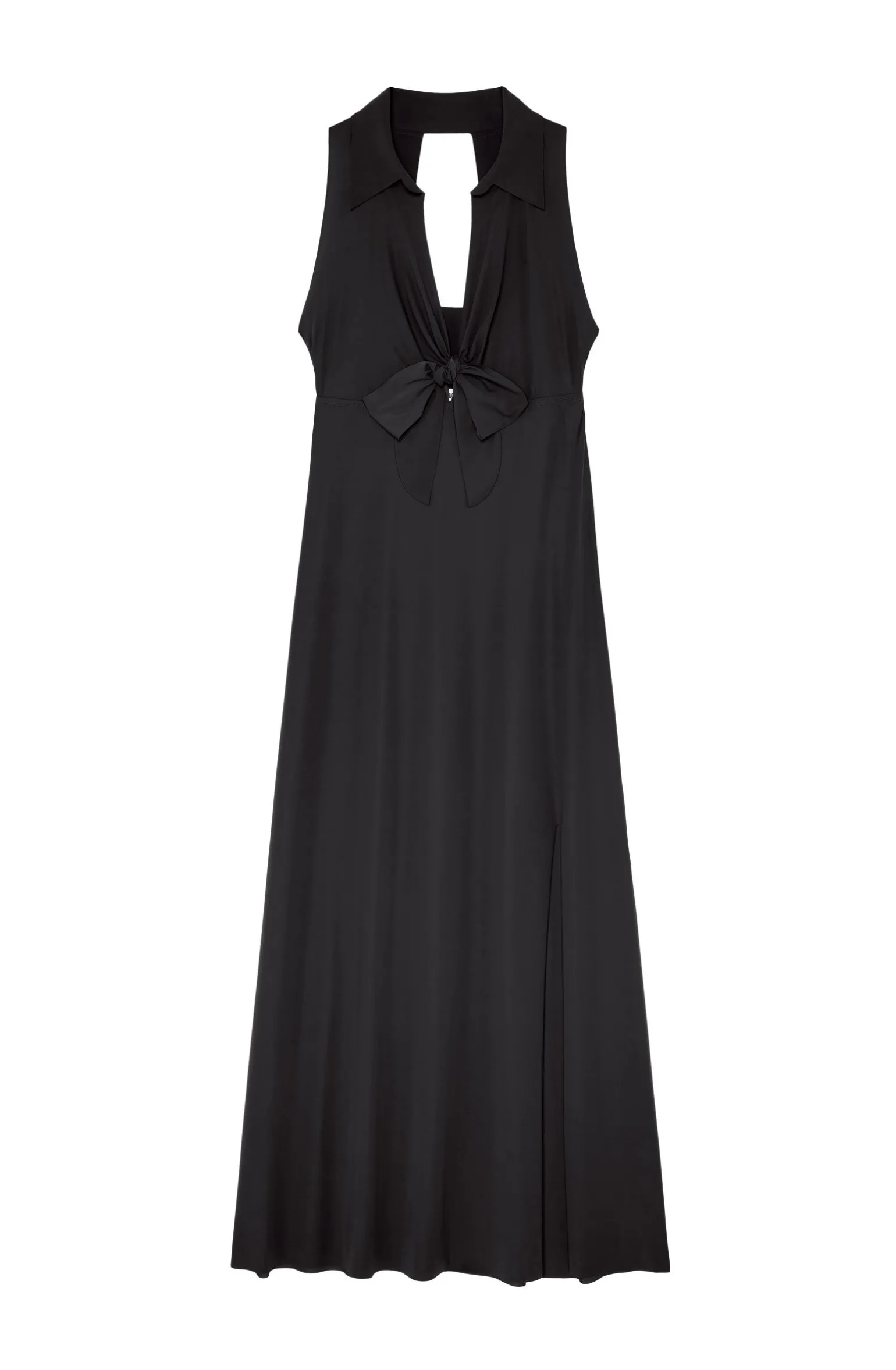 La robe longue fendue ROVA incarne l’élégance avec légèreté. Son haut, effet cache-cœur, se noue devant ou dans le dos et la couture sous poitrine met en valeur le décolleté. Avec son col chemise en bonded et son dos nu graphique, cette pièce est un incontournable. Le noir, couleur intemporelle et toujours élégante.