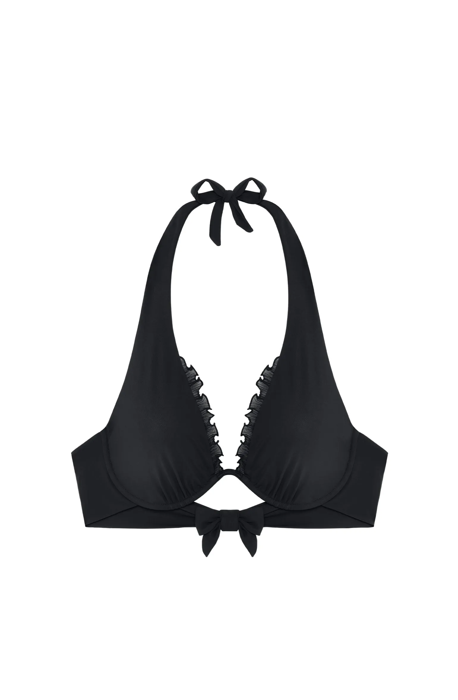 Le haut de maillot de bain SARY à armature unique, création iconique de Pain de Sucre, donne du volume à la poitrine en assurant un confort absolu. Ses bonnets se parent de volants en mousseline plissée pour dynamiser le décolleté. Ses bretelles se nouent derrière la nuque et dans le dos pour s’ajuster à toutes les morphologies. Le noir, une couleur intemporelle et toujours élégante.