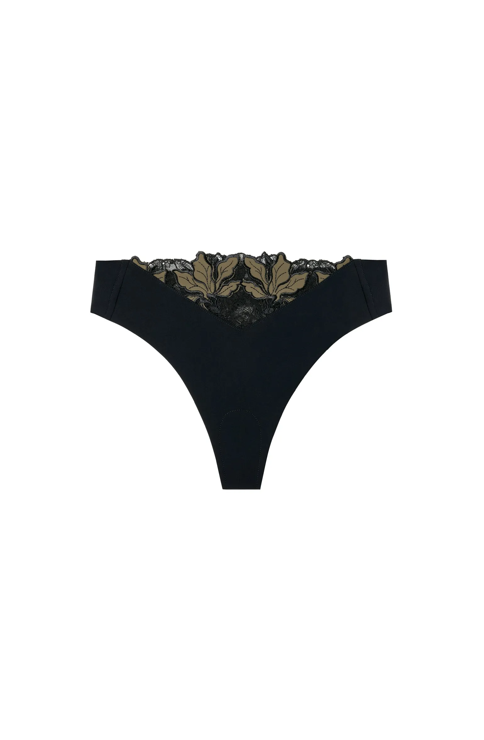 La coupe tanga de la culotte SILA en Bonded noir sublime les formes. Elle se pare devant et derrière d’une délicate dentelle aux motifs floraux. Lichen, une teinte organique, vert kaki.
