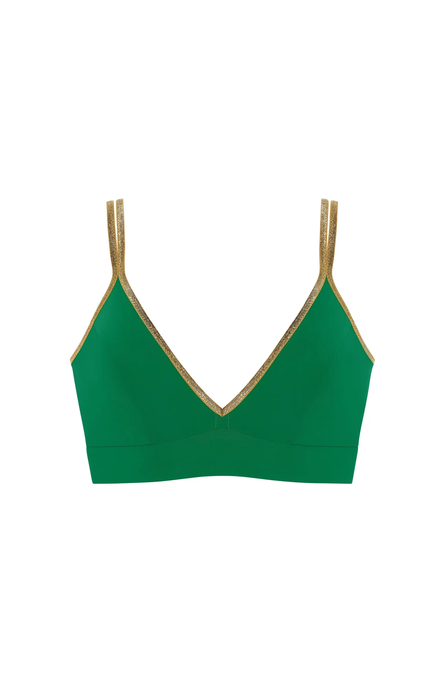 - Encolure en V devant et dos avec double bretelles réglables en bord plié élastique lurex doré sur l’endroit, doux sur l’envers