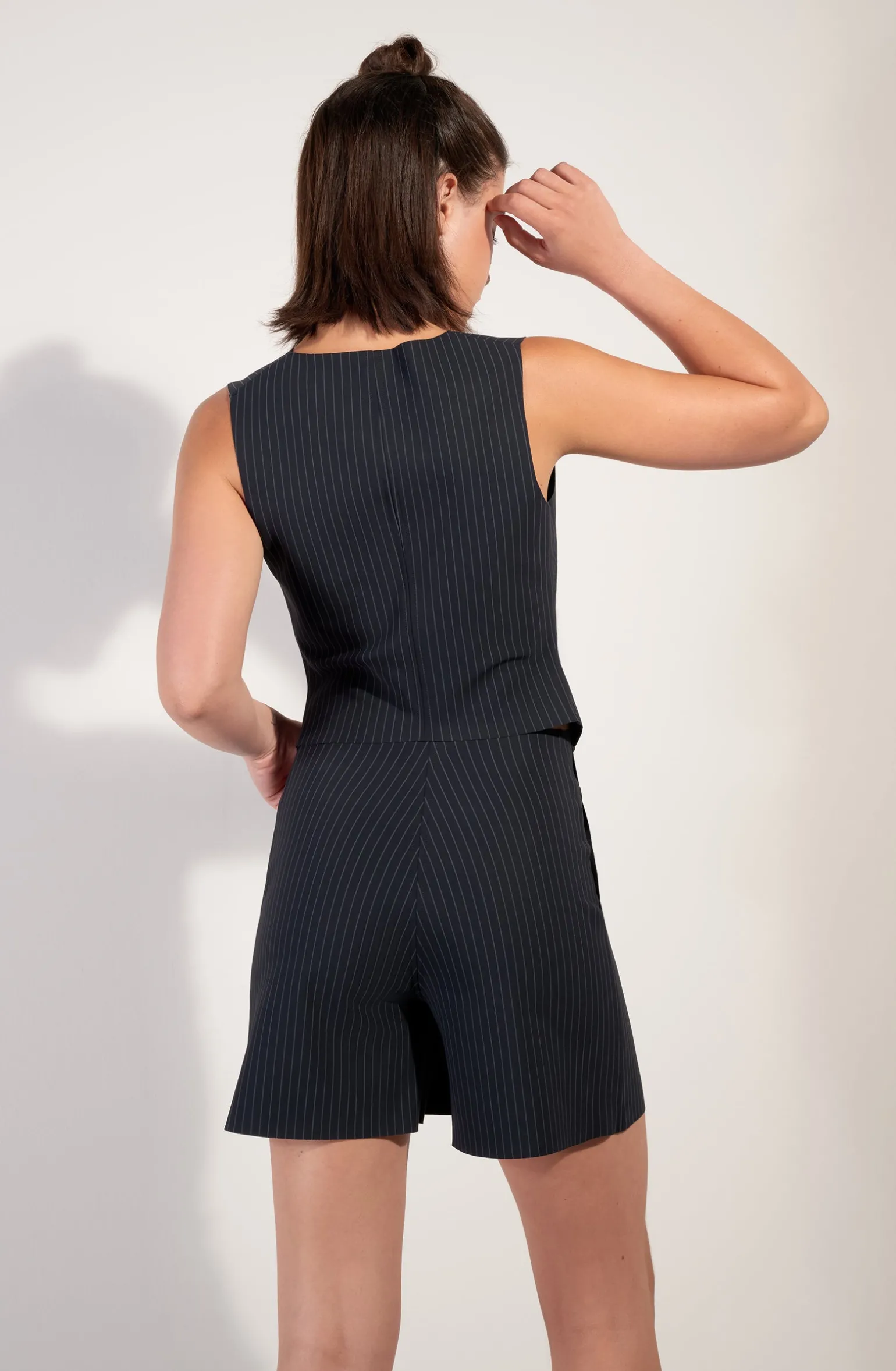 Le short jupe portefeuille Stann joue des effets de superposition avec style. Le pan de la jupe se rabat sur le short avec de délicats boutons-tige. Les finitions sans couture mettent en valeur les formes dans un confort absolu. Noir Rayé avec de fines rayures verticales, gris anthracite, pour dynamiser et allonger la silhouette.