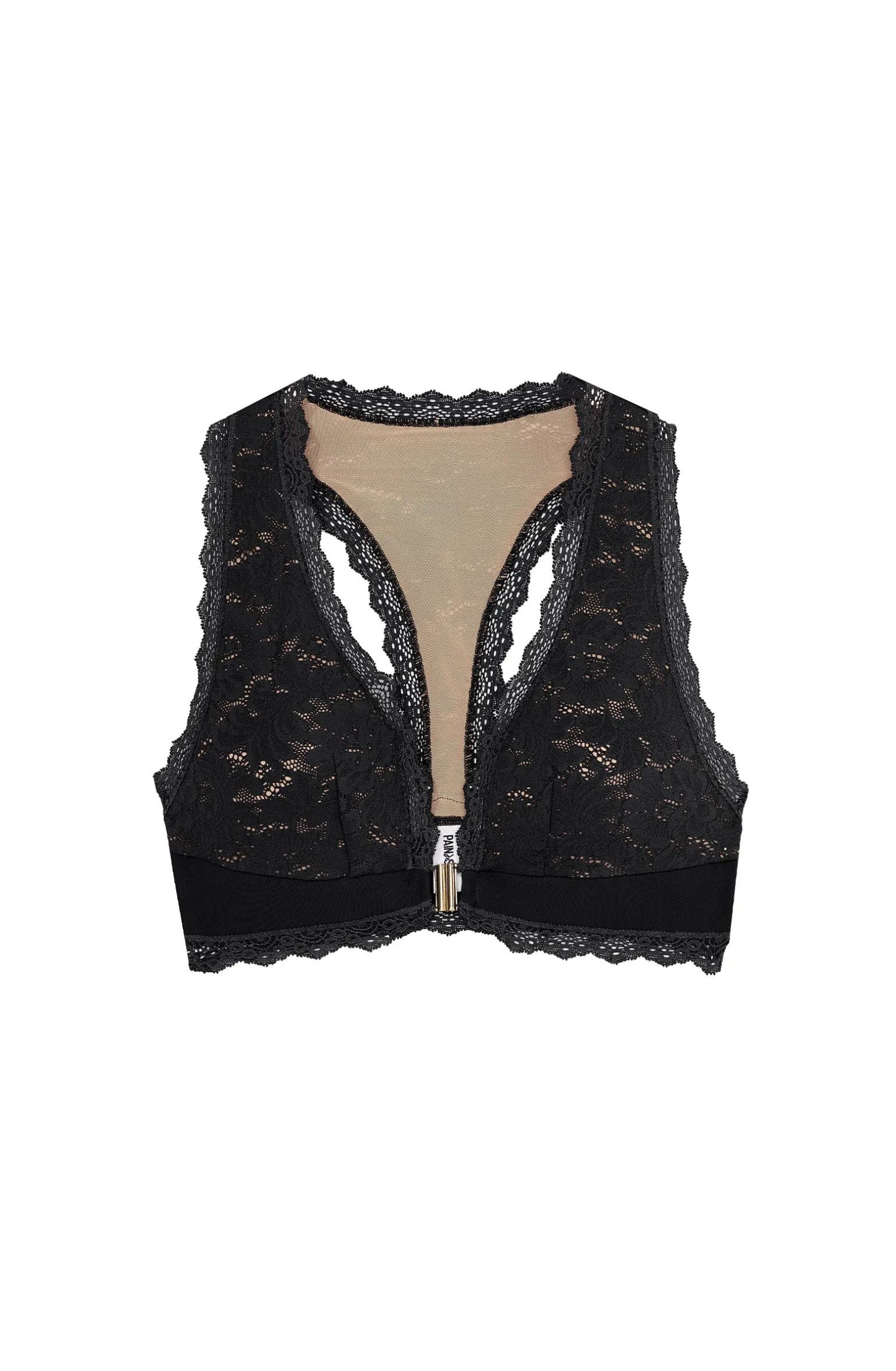 Sans armature, le soutien-gorge STELY offre un parfait maintien. Avec sa coupe inspirée d’une brassière et sa fermeture dorée sur le devant, ce haut confectionné en dentelle française mixe confort et élégance. Le noir, une couleur intemporelle et toujours élégante.