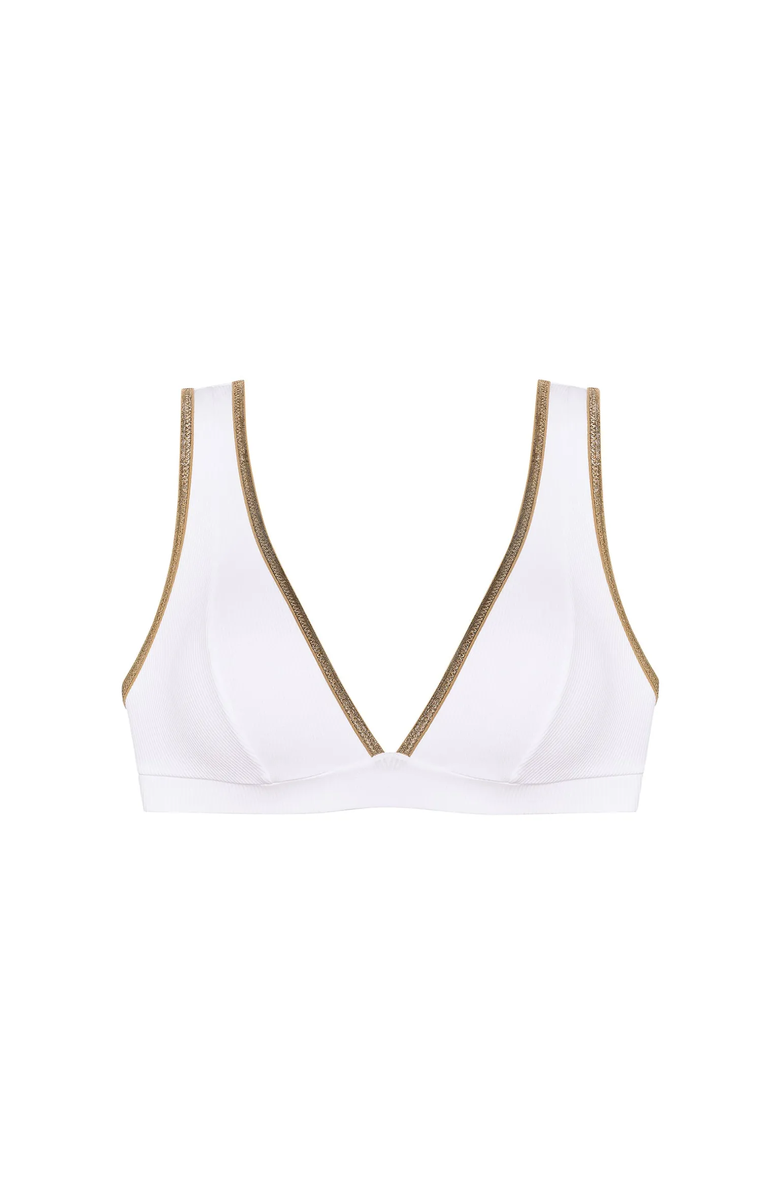 Avec ses larges bretelles et ses bonnets en triangle, la brassière STEVIE assure un confort et un maintien parfaits. Le relief côtelé du tissu en sensitiv lui donne un air vintage et le liseré doré sublime le décolleté. Ce haut de maillot se transforme en un crop top élégant pour une sortie d’été improvisée. Pur et délicat, le blanc illumine le teint.