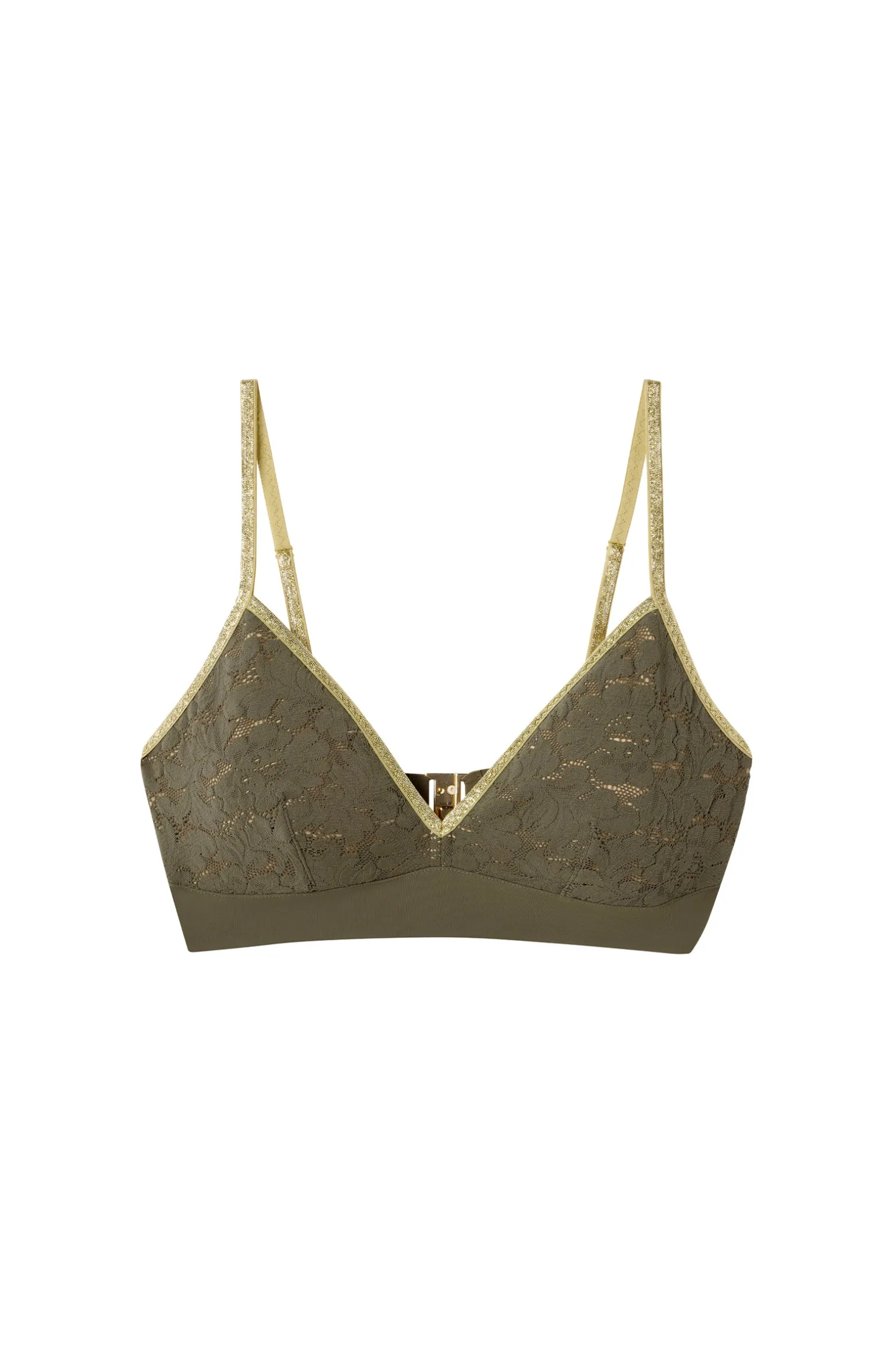 Doublée de tulle chair, la dentelle fine du soutien-gorge triangle SWANN sublime les courbes avec douceur. Pour un décolleté plus prononcé, les coques amovibles se glissent sous les bonnets. Un dessous raffiné qui se pare d’une élégante finition en lurex doré. Lichen, une teinte organique, vert kaki.
