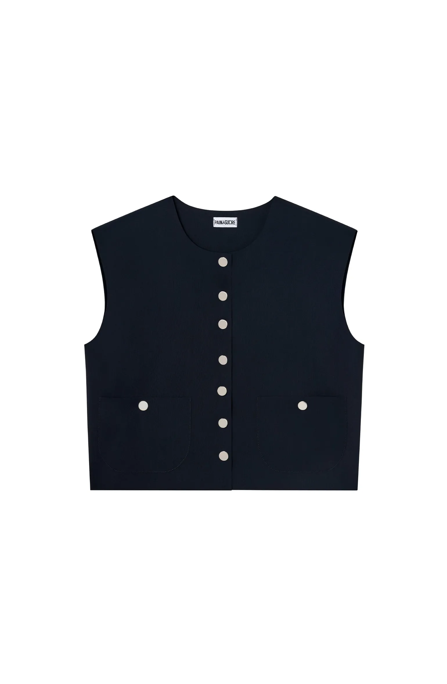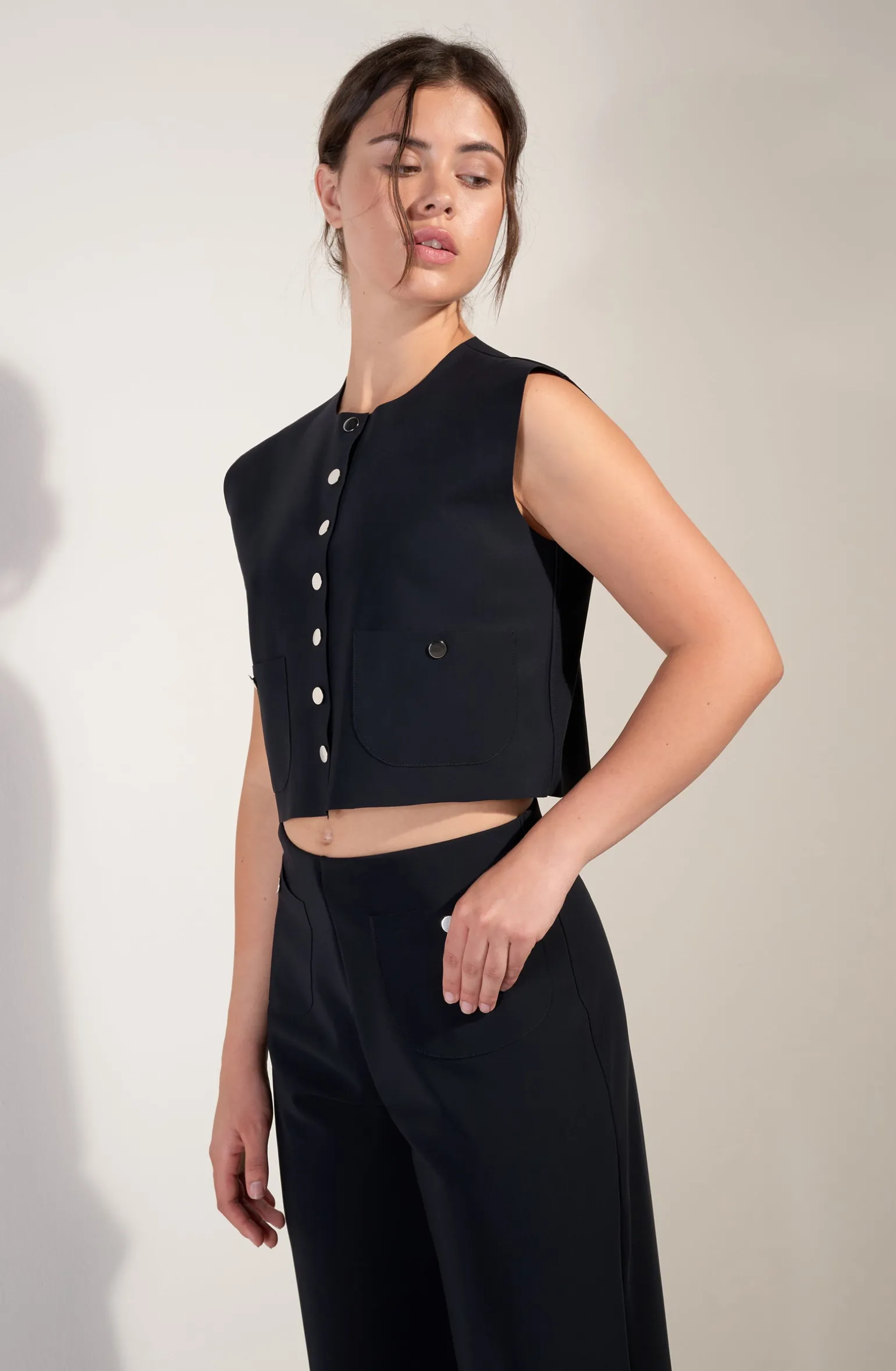 Réinvention du veston rétro sans manche, Tanhi dessine une silhouette intemporelle. Sa coupe, aux finitions sans couture, est structurée de détails délicats : sept boutons-tige réversibles argentés. Ce haut court ultra moderne s’associe avec un pantalon taille haute. Le noir, une couleur toujours élégante.