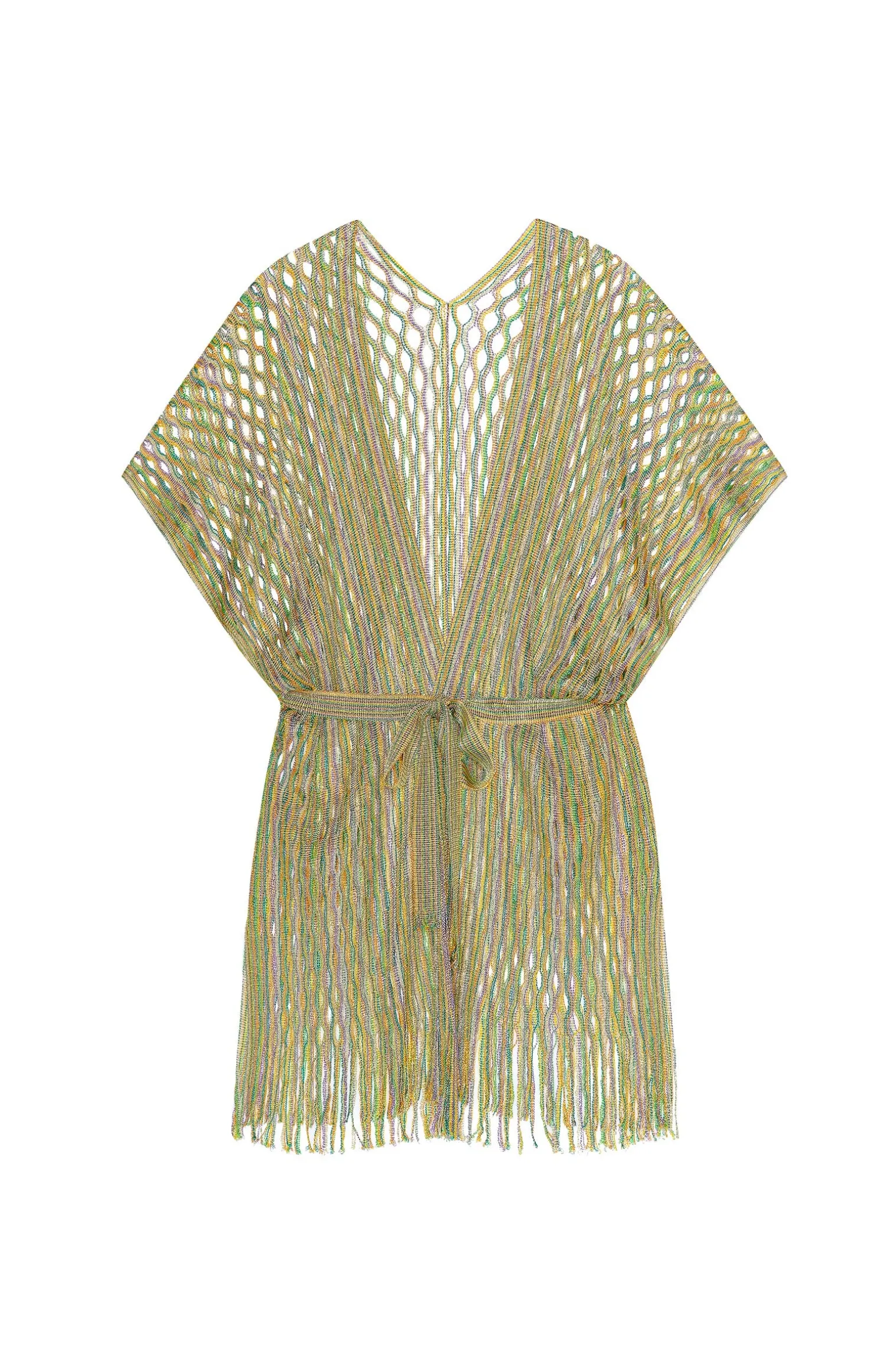Pièce d’exception, la veste courte VELIA, conçue en large maille filet, dévoile intensément la silhouette. Dans un style bohème assumé, les reflets irisés du lurex doré subliment la peau hâlée. L’imprimé multicolore, un chamarré de coloris vifs et vintage.