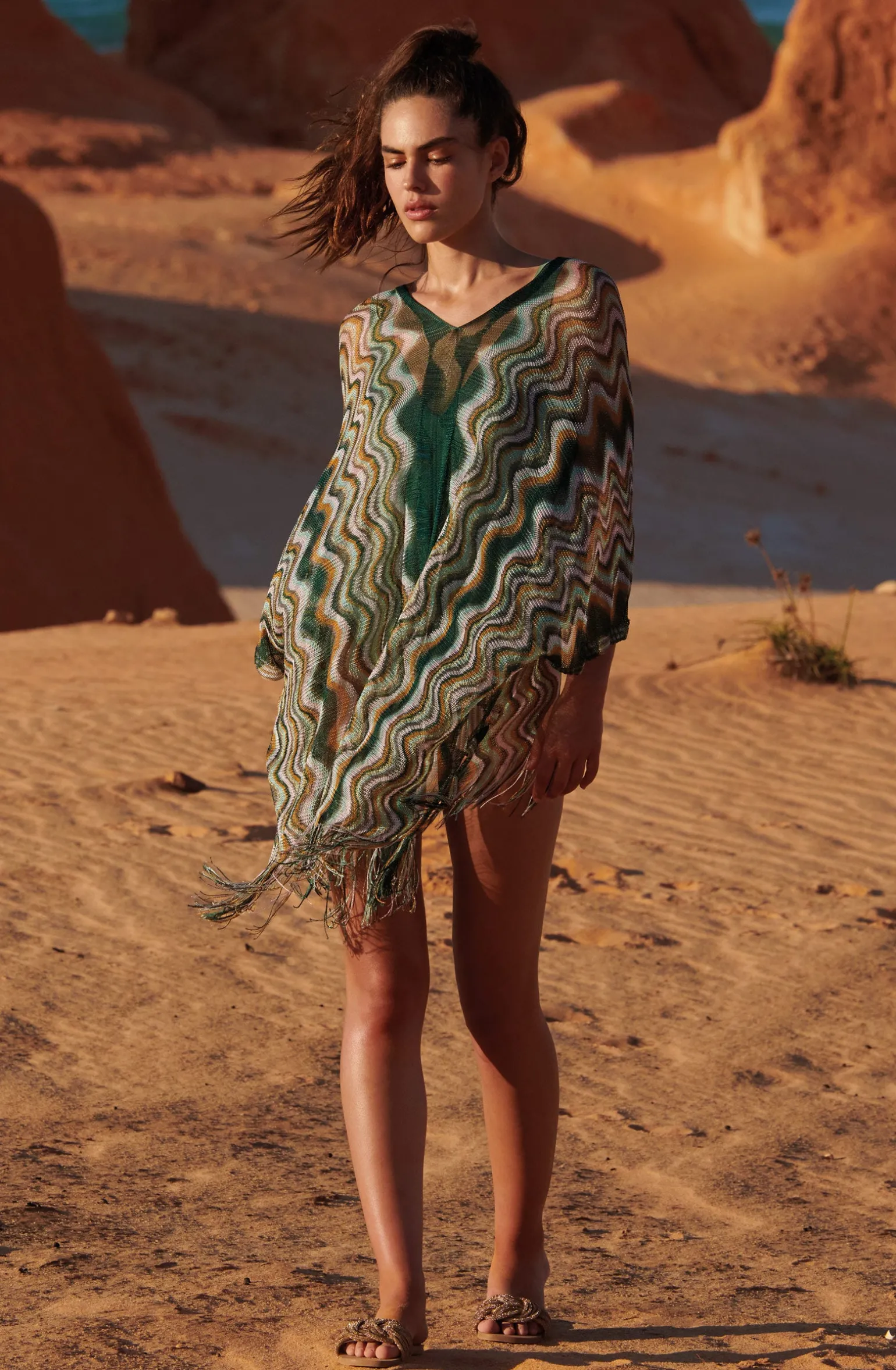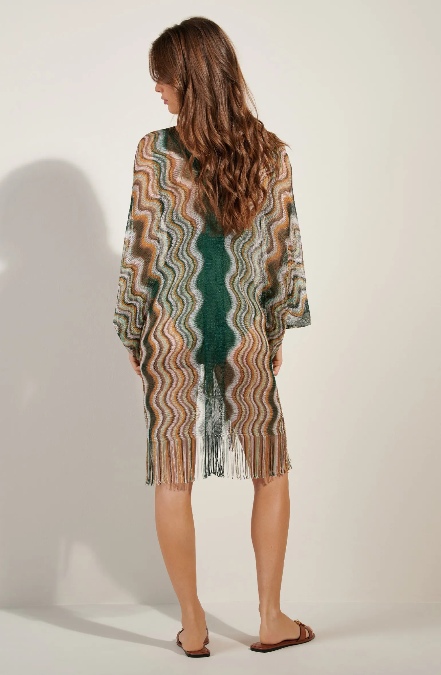 La tunique de plage BAY dévoile avec subtilité les courbes féminines. Avec son encolure en V, sa découpe arrondie et ses franges sur le bas, ce poncho ajouré joue du style bohème avec raffinement. Confectionné en fine résille tissée avec du lurex, les reflets irisés de son imprimé zigzag électrisent la silhouette. Bambou, un vert foncé, ode à la nature.