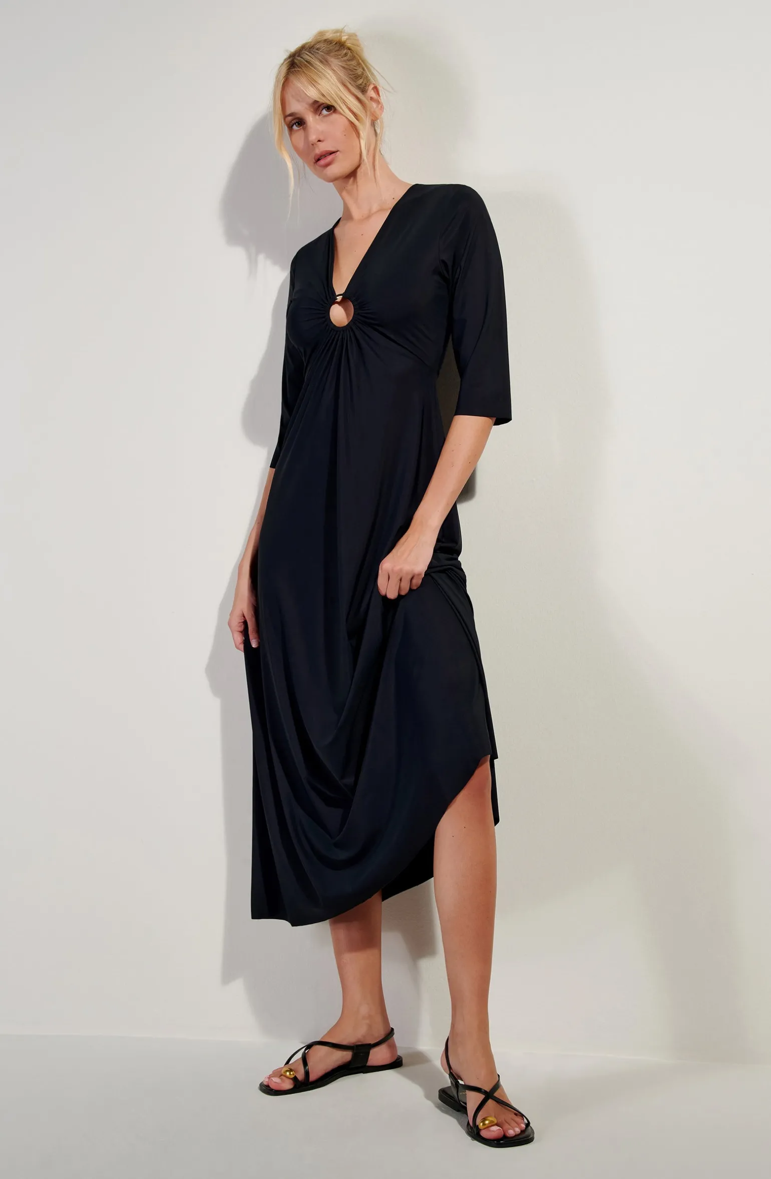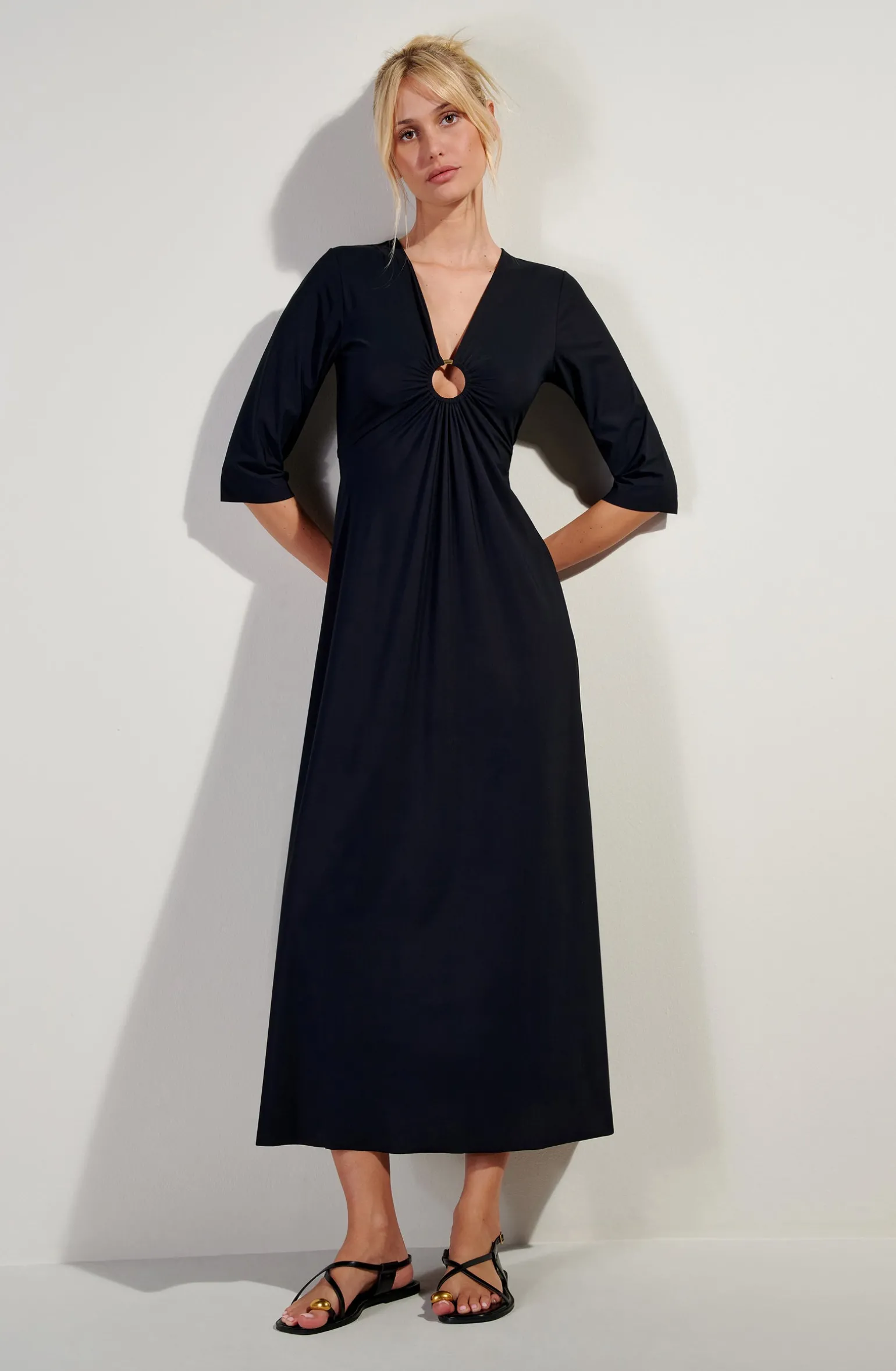 Robe longue manche trois quart avec anneau doré milieu devant