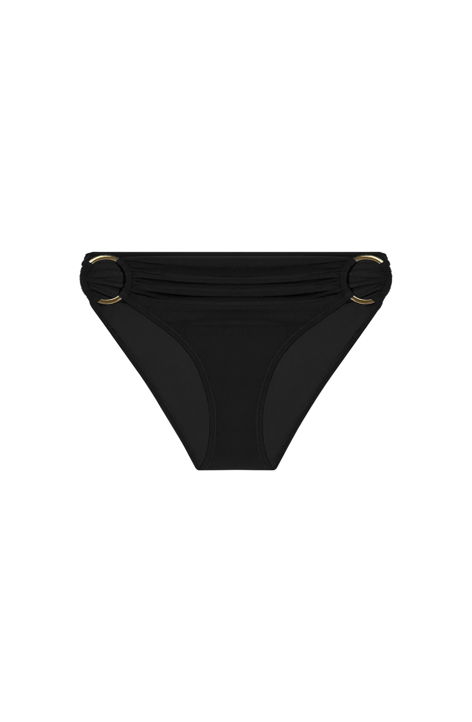 L’allure rétro de la culotte haute CHARME met en valeur les formes féminines. Détail sophistiqué, le bas de maillot se drape sur chaque côté autour d’un anneau en zamac doré pour un effet plissé qui affine toutes les morphologies. Le noir, une couleur intemporelle et toujours élégante.