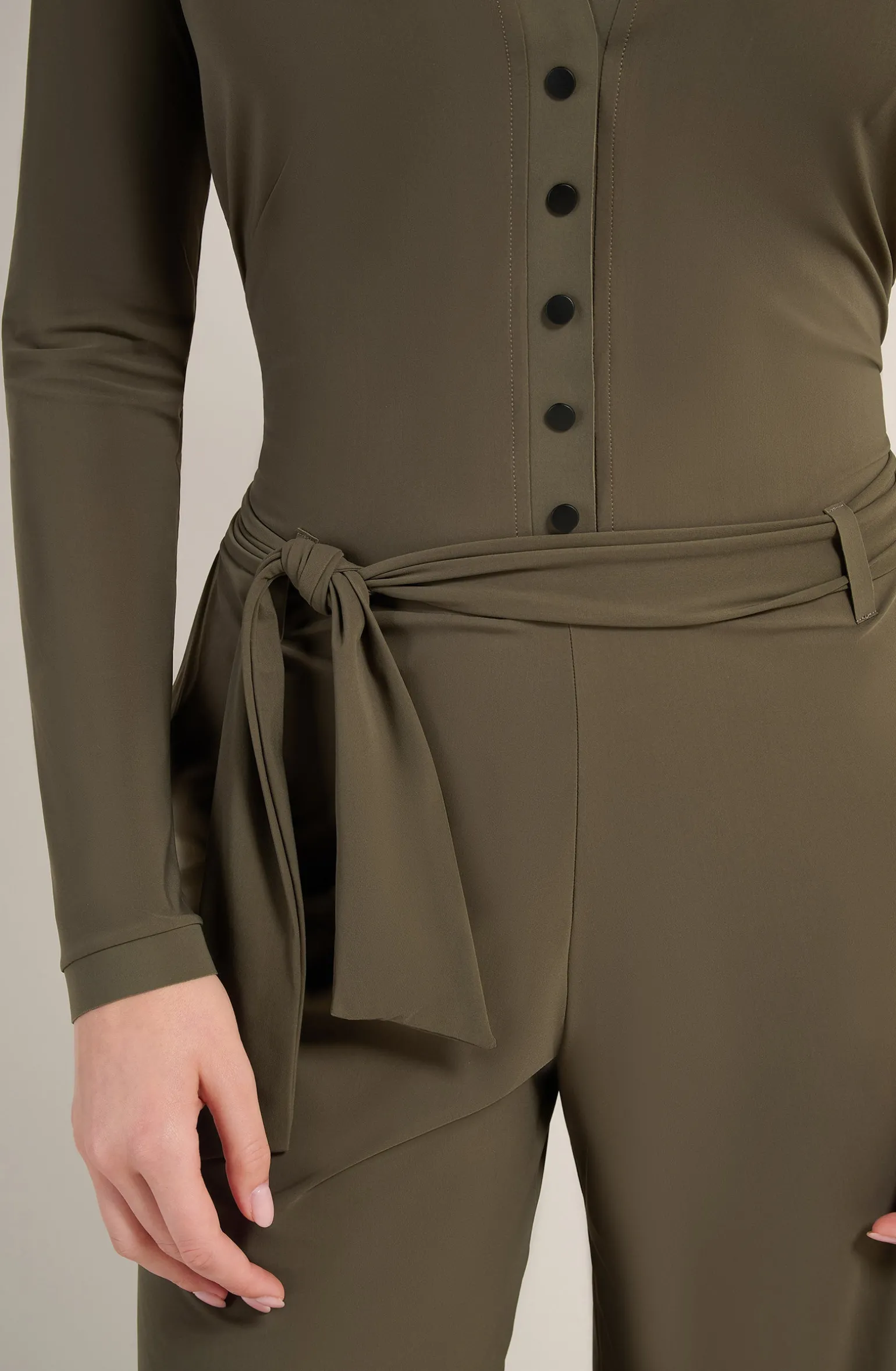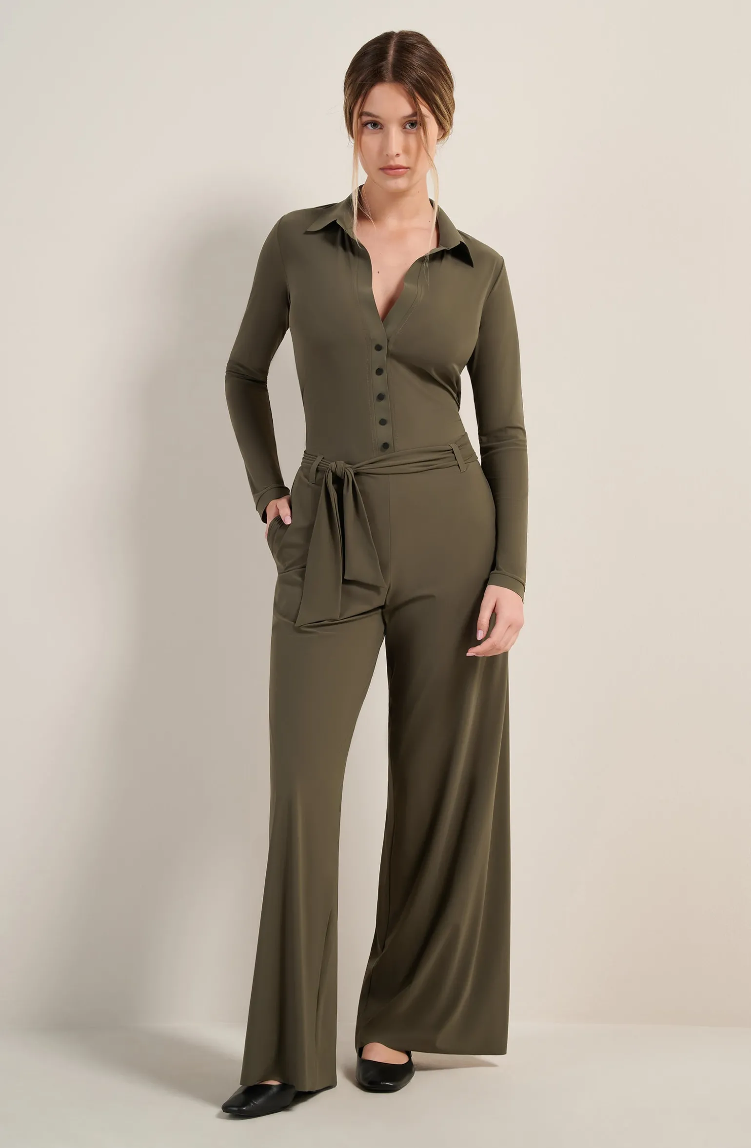 Avec son pantalon fluide et son chemisier délicat, la combinaison COLBI met en valeur la silhouette avec simplicité. Les finitions en Bonded et les boutons-tige amovibles soulignent l’allure raffinée de cette tenue. Lichen, une teinte organique, vert kaki.