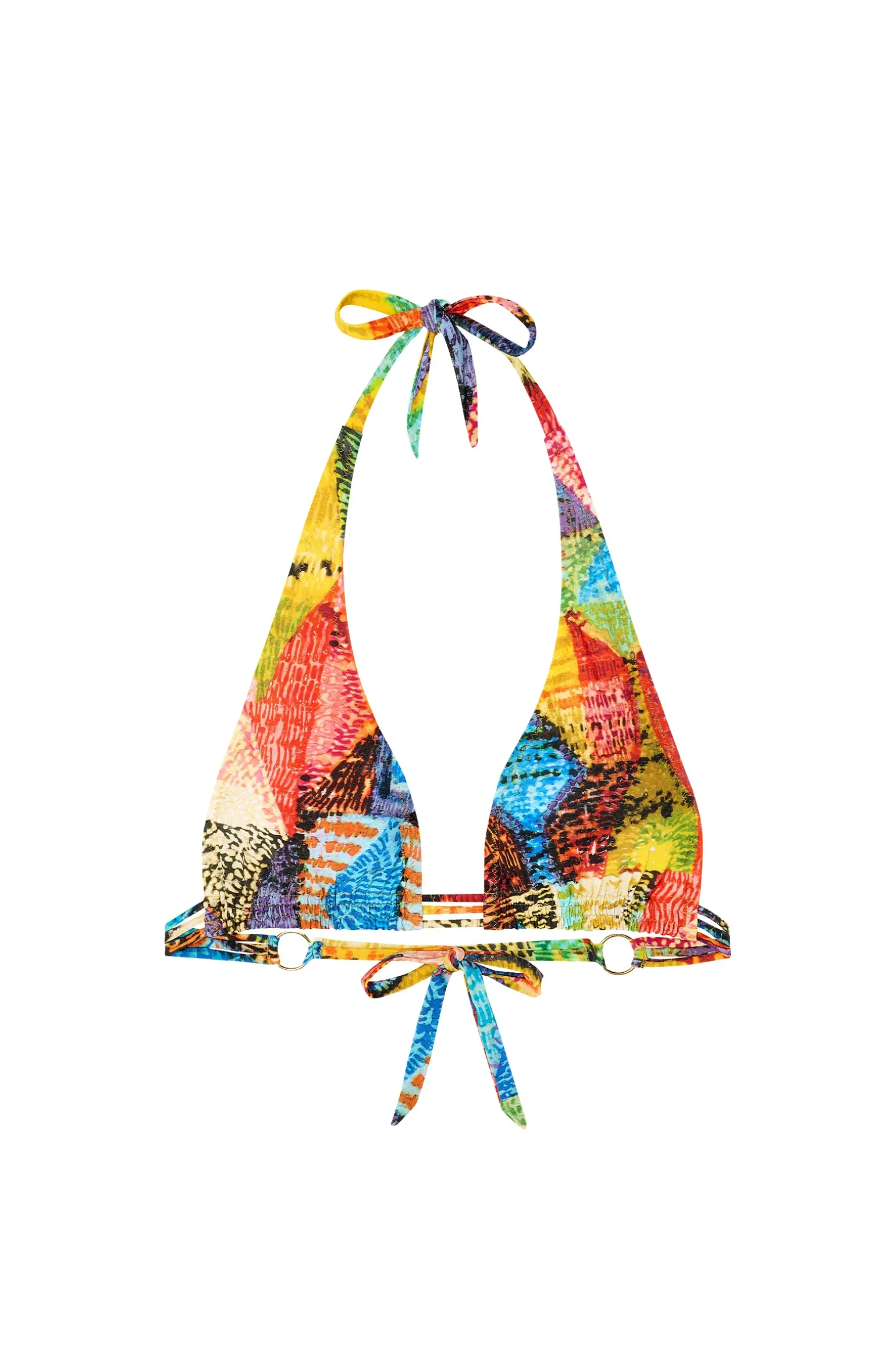 Pour mettre en valeur toutes les silhouettes en leur offrant un confort total, CRISSY est un triangle doté de coques amovibles et d’un triple cordon sous la poitrine qui s’ajuste en le nouant dans le dos. Les coutures plissées sur les bonnets donnent du galbe à la poitrine. Festival de couleurs tel un sacre de printemps indien, l’imprimé Holi nous enivre de parfums lointains et nous submerge d’effluves épicés.