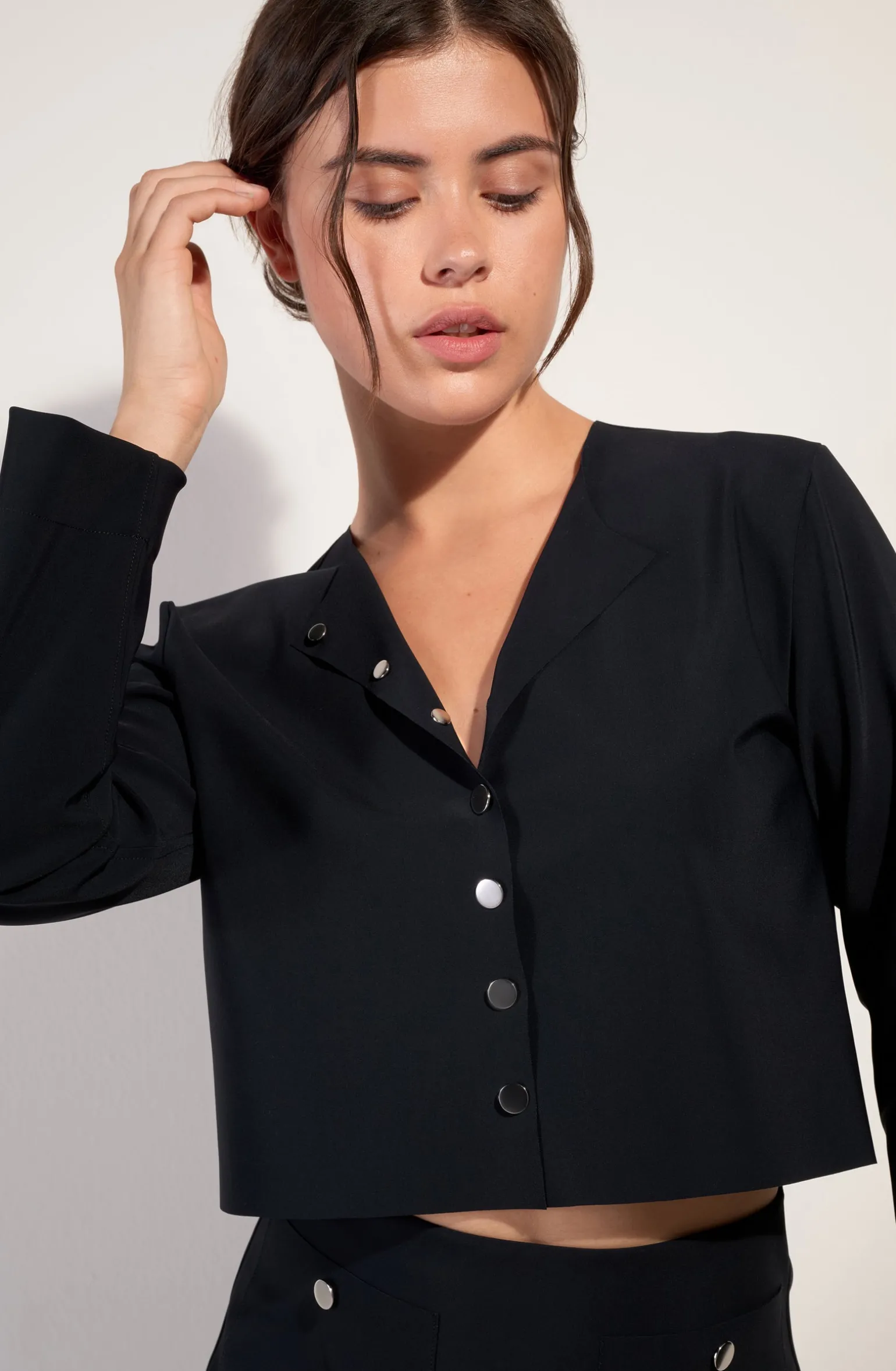 Soigneusement travaillé, le veston court Dao s’orne de boutons-tige réversibles. Avec son col rond sans couture, ce spencer sublime l’allure en toute liberté. Le noir, une couleur intemporelle et toujours élégante.