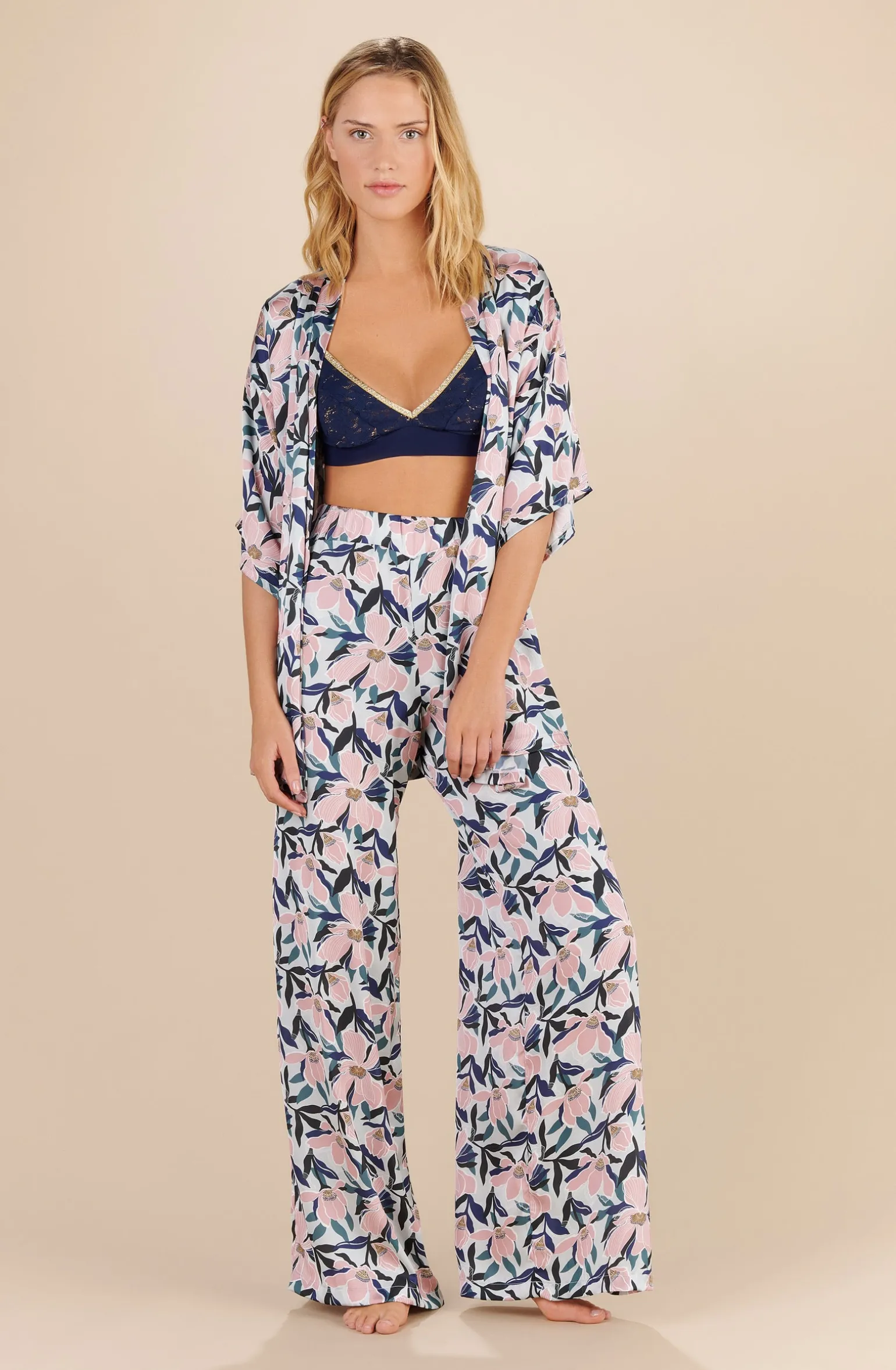 Frais et fleuri, l’imprimé MAGNOLIA du kimono en satin DELILA se décline sur le caraco ELFY et le pantalon TOM. Pour se parer de soie délicate, le même ensemble ELFY et TOM s’assortit sur de douces nuances rose poudré. Avec le top NAHRA en viscose marine et un jean, DELILA se transforme en une veste élégante.