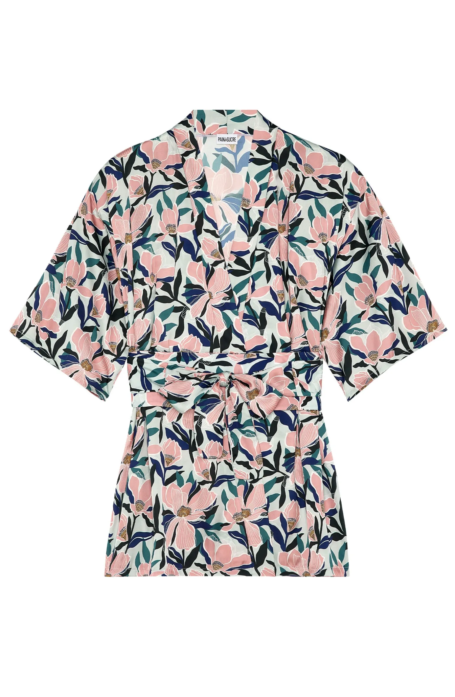 Kimono en satin imprimé fleuri, finition coutures anglaises, large ceinture.
