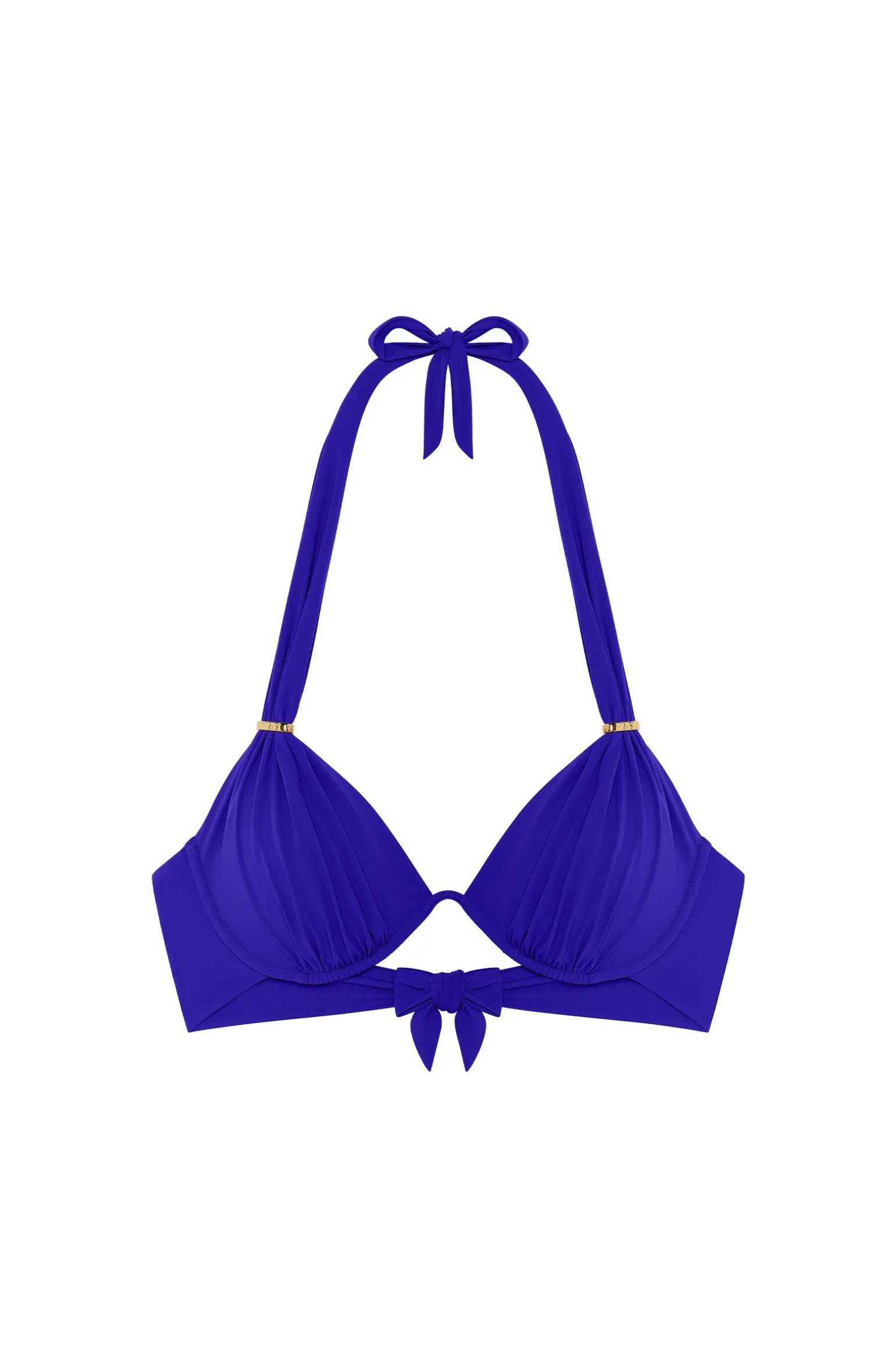 Avec son armature unique, dégagée entre les bonnets, le haut de maillot de bain FABIA est un modèle iconique indémodable. Moderne et raffiné, il se noue dans le dos et derrière la nuque pour s’ajuster parfaitement à la silhouette. Les fronces sous poitrine donnent du relief et les anneaux métalliques le long des bretelles permettent de jouer sur la profondeur du décolleté. Saphir, un bleu envoûtant, profondément lumineux.