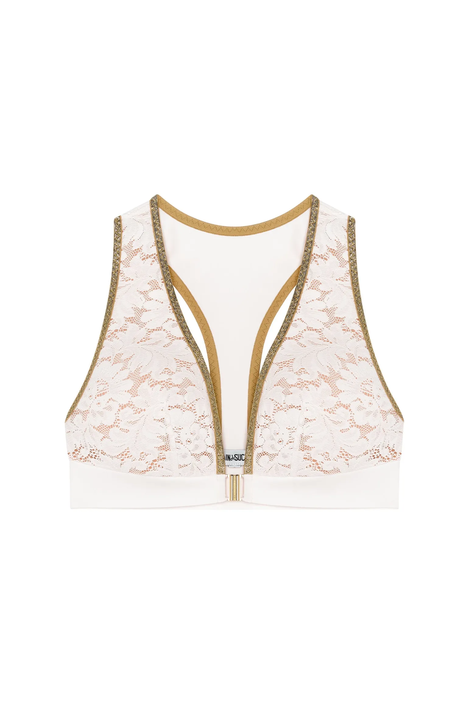 Sans armature, le soutien-gorge GENIA offre un parfait maintien. Avec sa coupe inspirée d’une brassière et sa fermeture dorée sur le devant, ce haut confectionné en dentelle française mixe confort et élégance. Il se pare avec éclat d’une somptueuse finition en lurex doré sur l’encolure. Un blanc au sous ton chaud inspiré de l’écume des vagues.