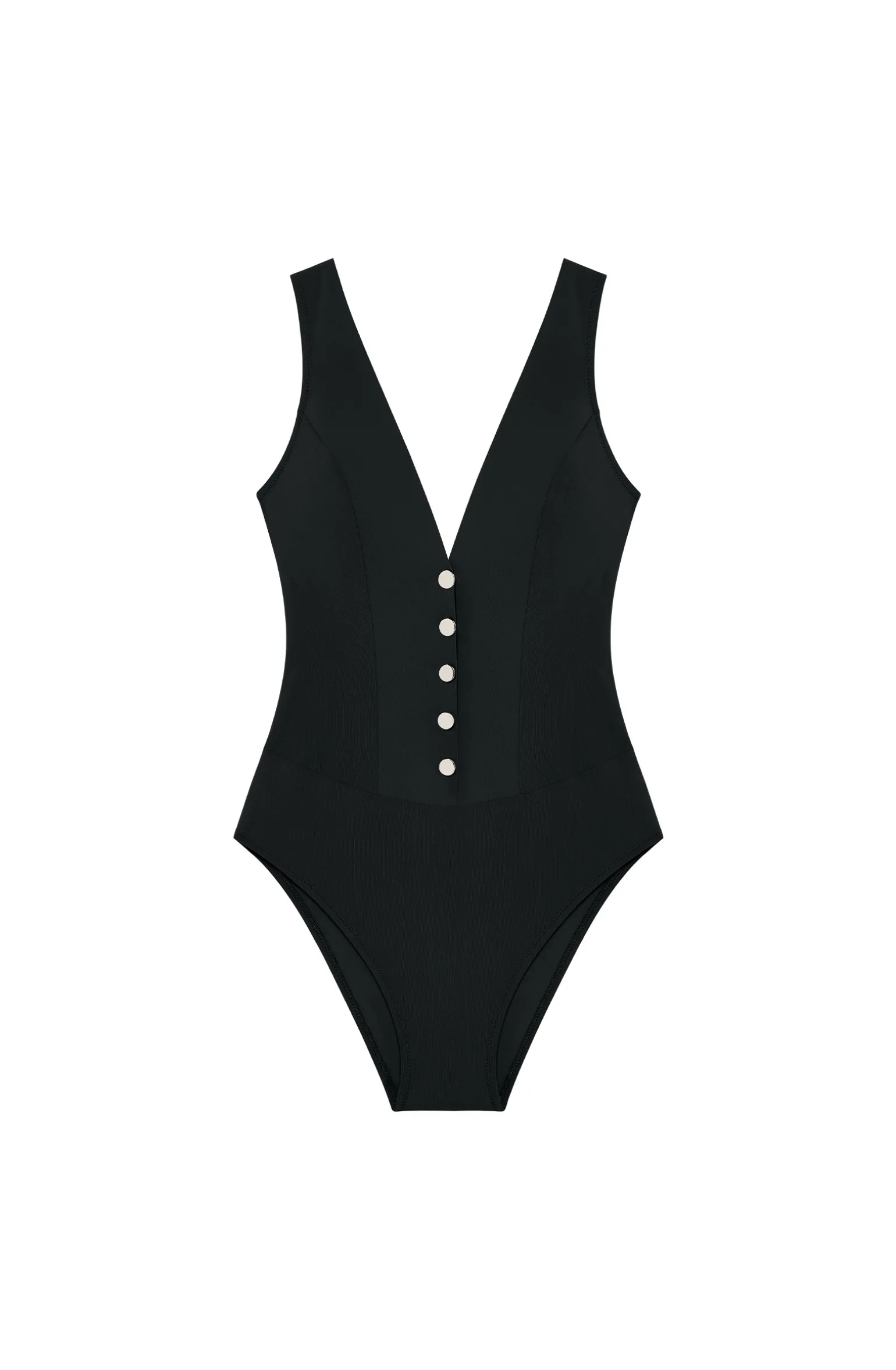Le nageur GILLIE s’inspire de l’iconique maillot une pièce PIPPER. Cette version se distingue avec ses profonds décolletés en V. Devant, les boutons de manchettes réversibles soulignent la poitrine avec fantaisie et donnent à ce haut une allure de gilet. Le noir, couleur intemporelle, toujours élégante.